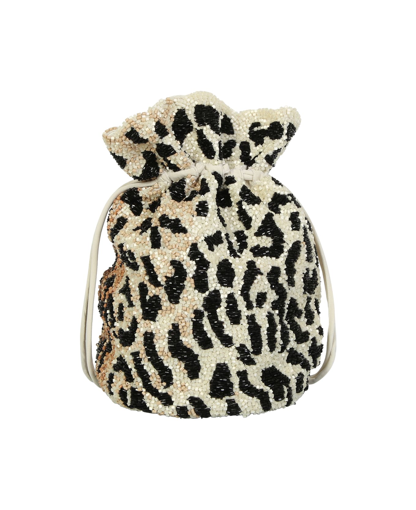 Drawstring fastening. All-over leopard print. Bead embellishment. Two top handles. Color: light brown