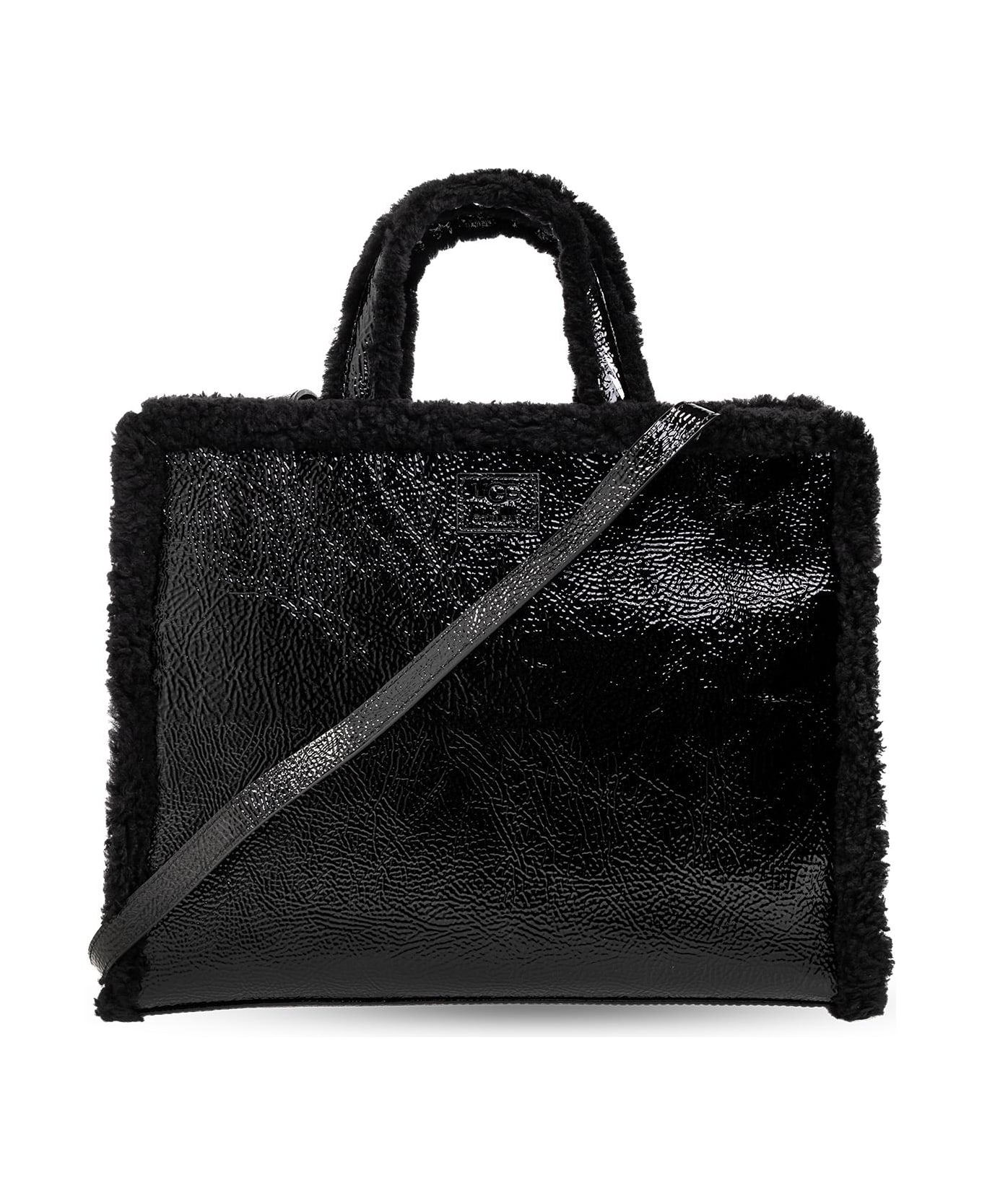 Black shoulder bag from UGG x Telfar. Size medium. Made of patent-grained leather, this design fastens via a magnetic snap and features a logo patch on the front, two half-round handles, a shoulder strap, silver-tone metal hardware and one internal compar