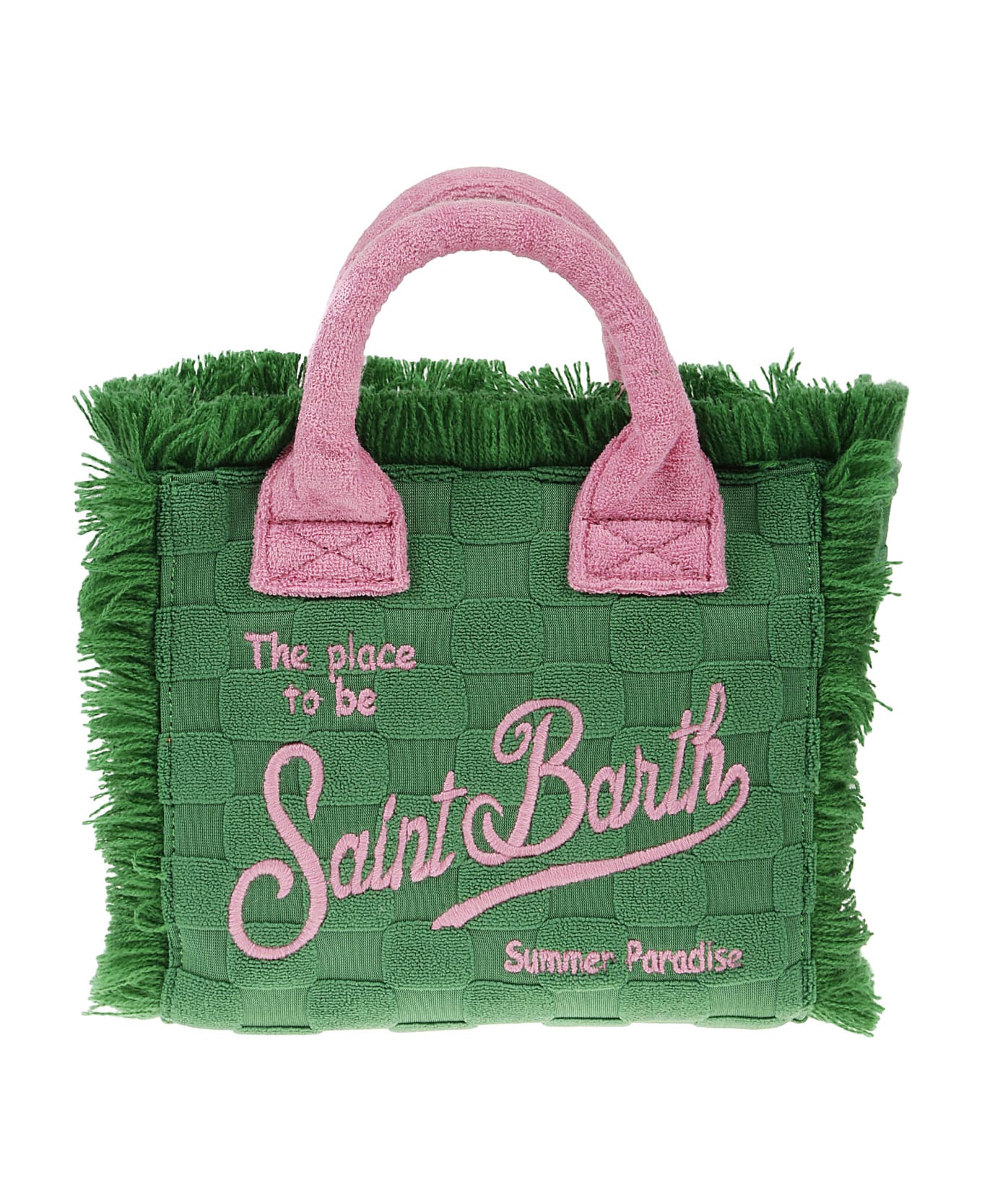 MC2 Saint Barth Bag in green cotton, sponge effect, fringe insert, pink logo embroidery, pink handles, shoulder strap, size 22x17x10 cm Composition: 100% Pl