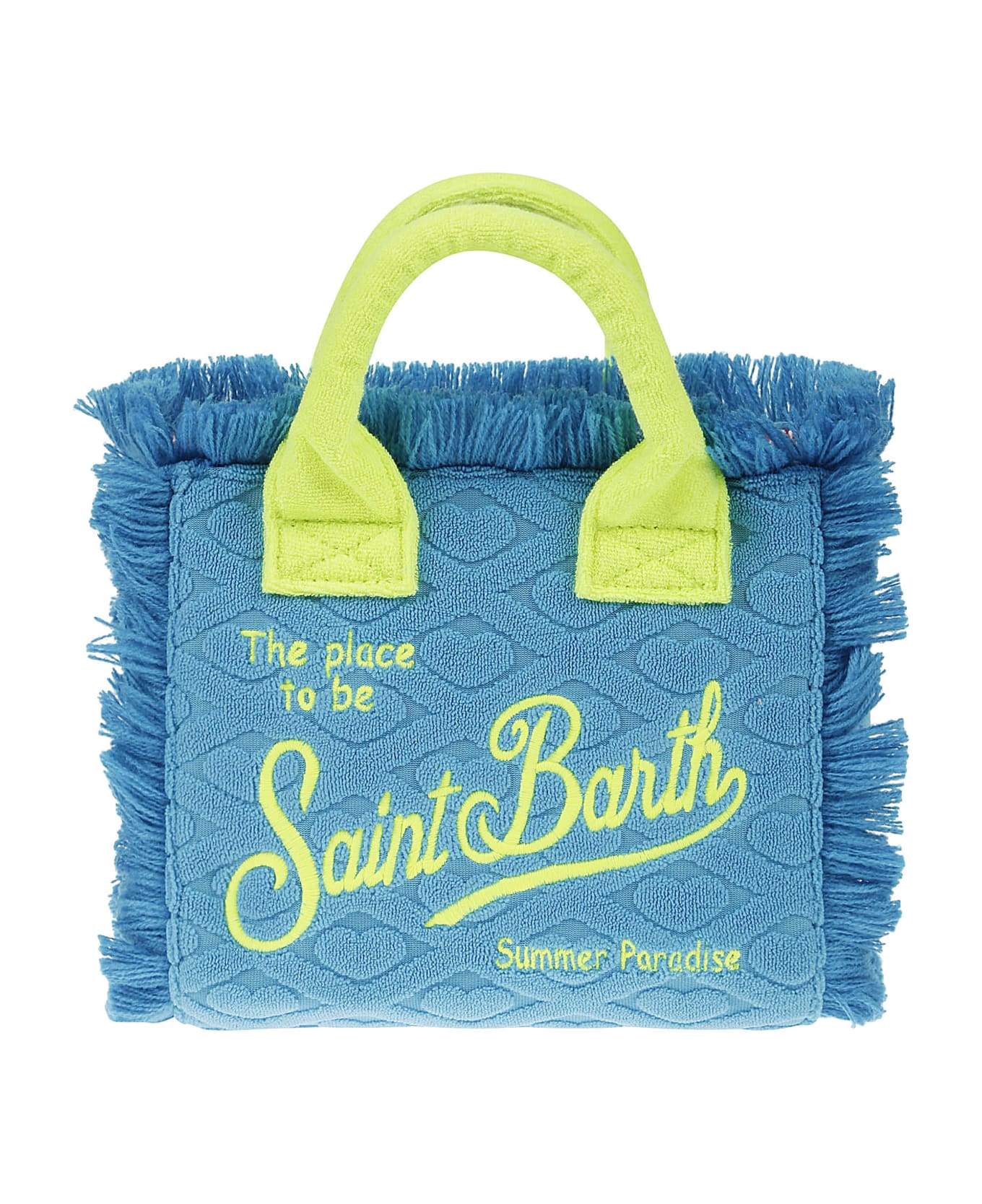 MC2 Saint Barth Light blue cotton bag, sponge effect, fringe insert, green logo embroidery, green handles, shoulder strap, size 22x17x10 cm Composition: 100% Pl