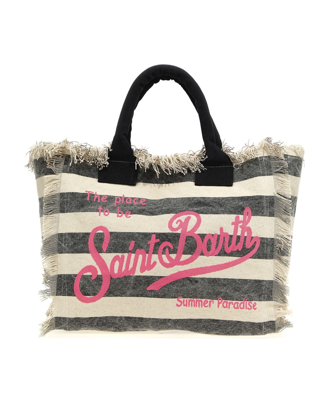 Vanity' striped canvas shopping bag with front and back logo print, fringes at the edges, double contrast handle and a zip closure. Composition: