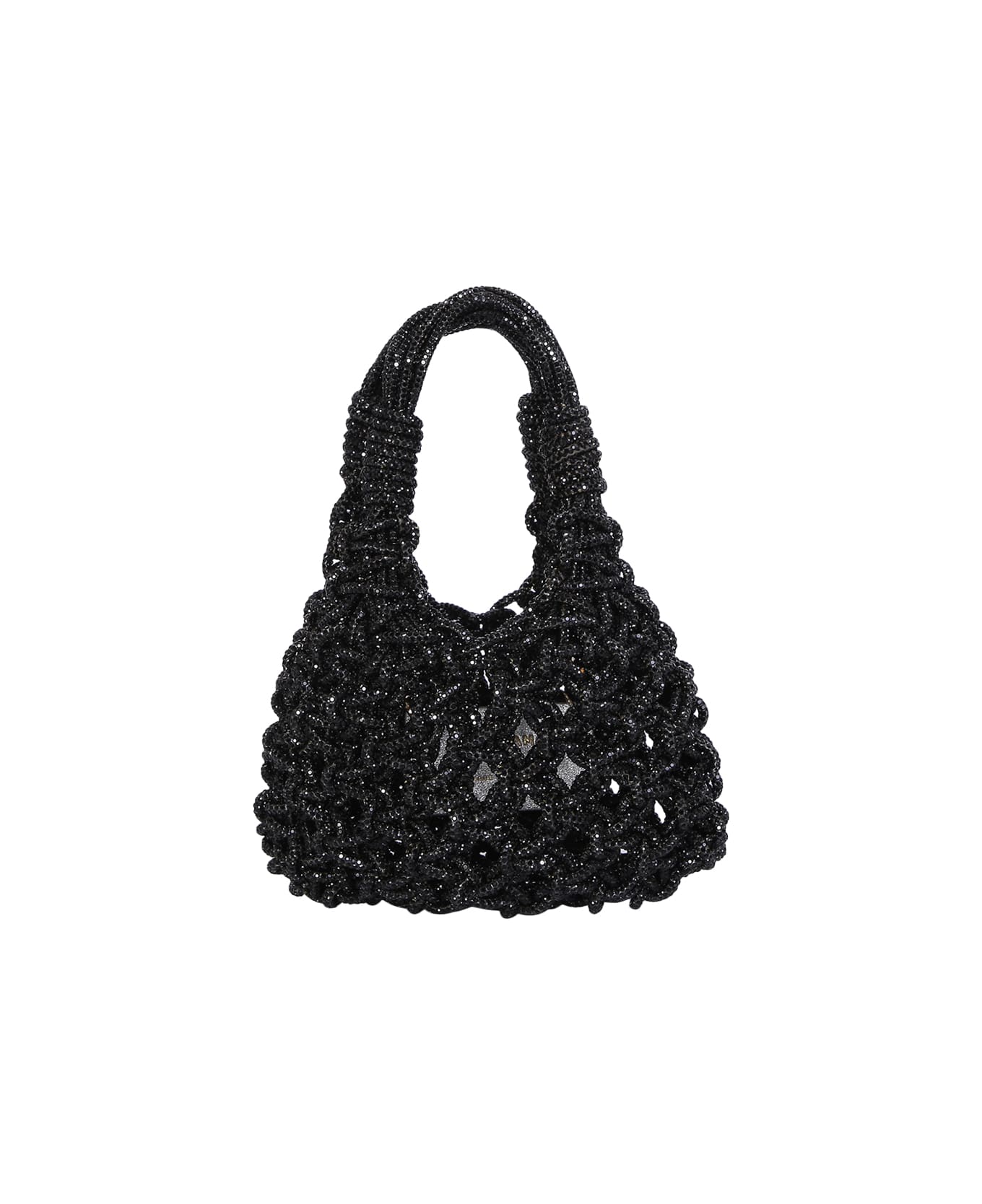 Hand woven bag in macramé technique with crystal thread. Single handle. Main compartment. Colour: Black