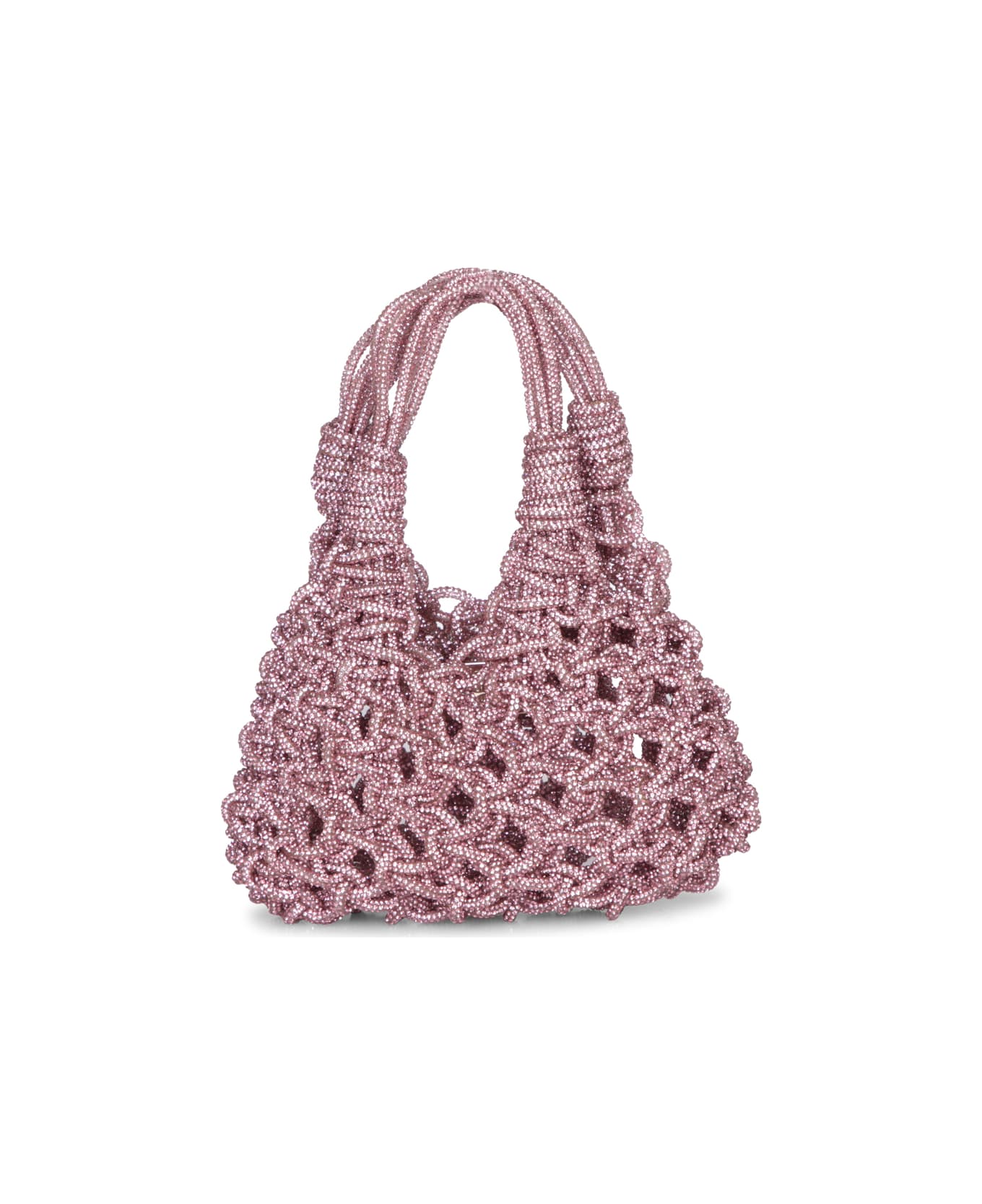 Hand woven bag in macramé technique with crystal thread. Single handle. Main compartment. Colour: Rose