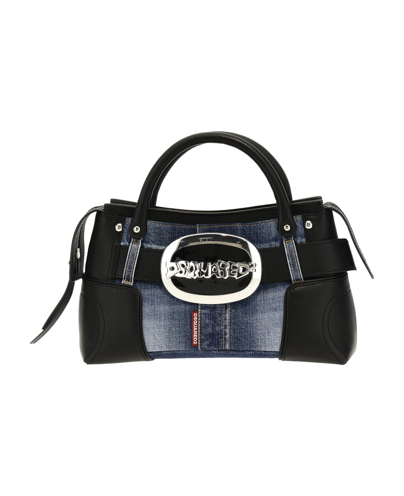 'Vintage Closet' denim and leather handbag, front logo plaque, double handle, and zip closure.