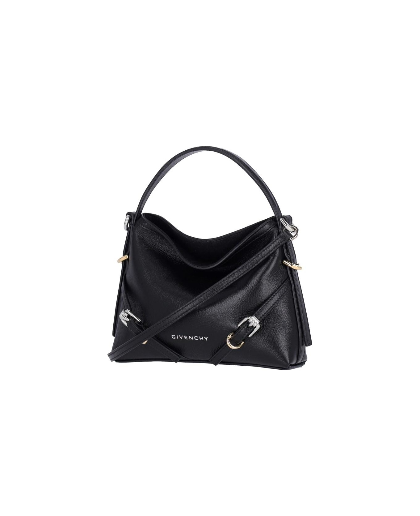 Givenchy Voyou nano bag in black hammered leather with top handle, thin removable shoulder strap, adjustable straps on the front, silver embossed logo on the front, and a single inner compartment.