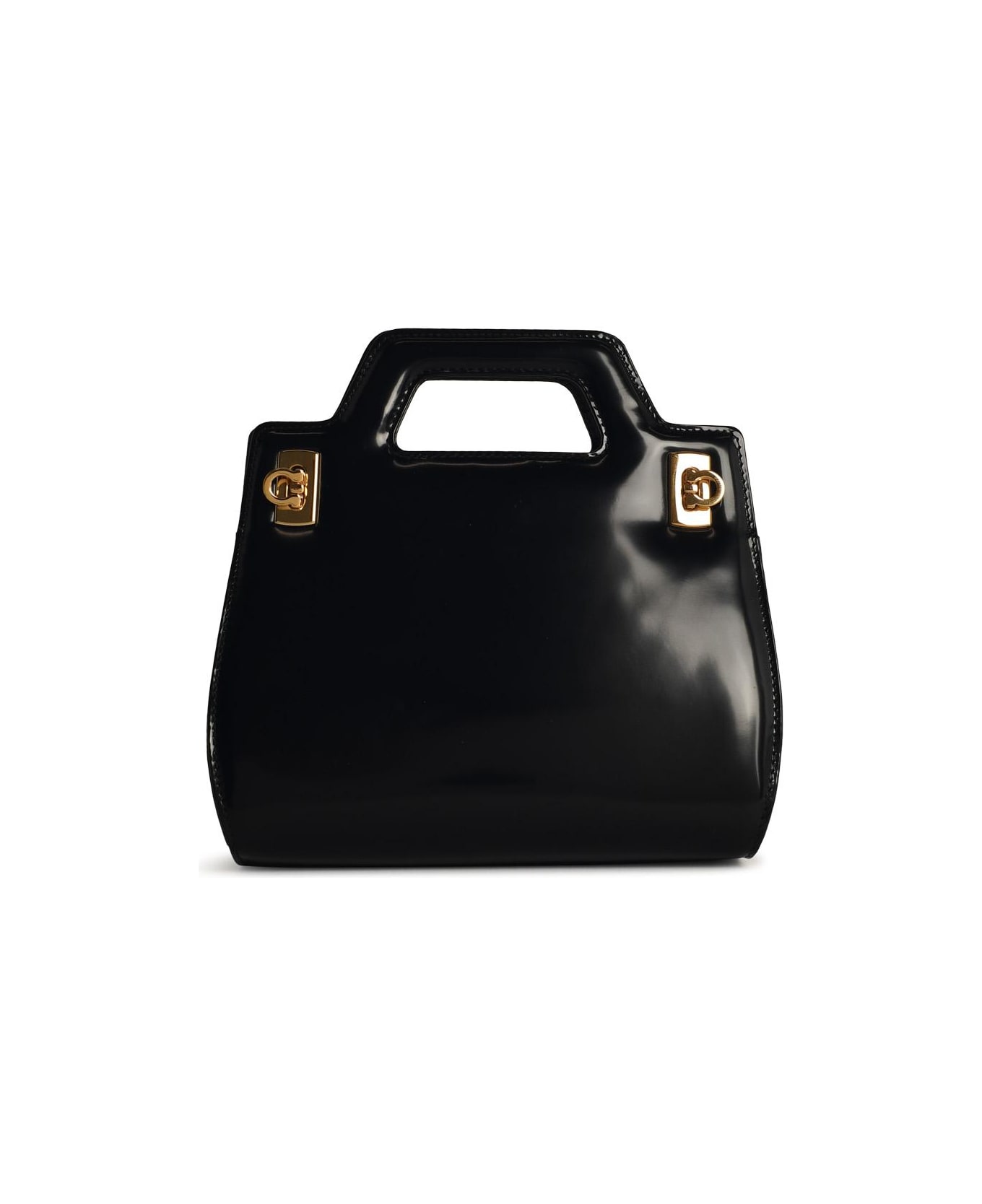 Double rigid handle, two logo eyelets along the sides, interlocking closure, single compartment, inner slit pocket\n20 x 21 x 8 cm Composition: 100% calfskin leather
