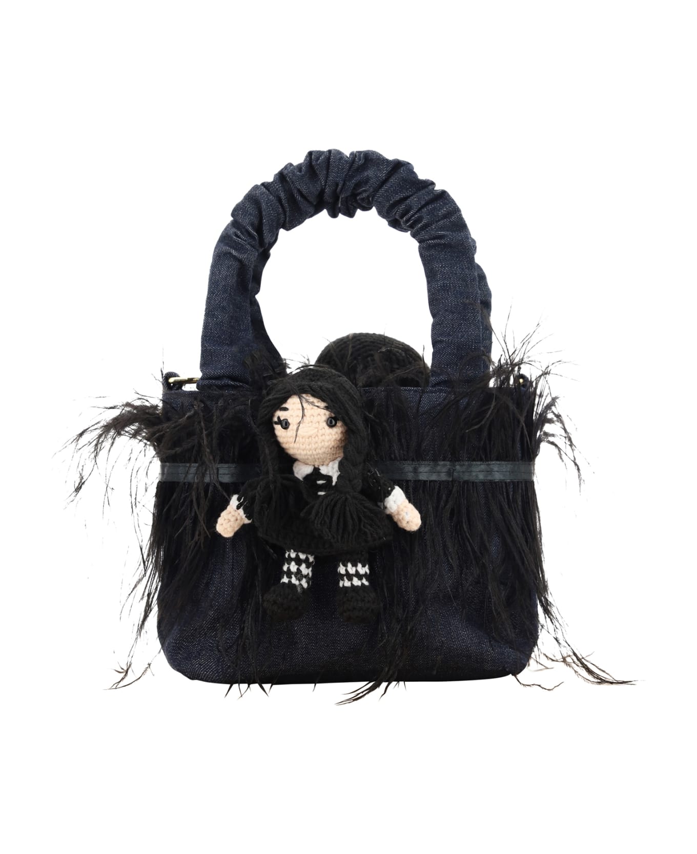 Fabric wednesday handbag by la milanesa, single top handle with ruching effect, interior snap button closure, denim design, all-over contrasting feather appliqué, embossed wednesday rag doll detail on front, removable fabric ruching shoulder strap.