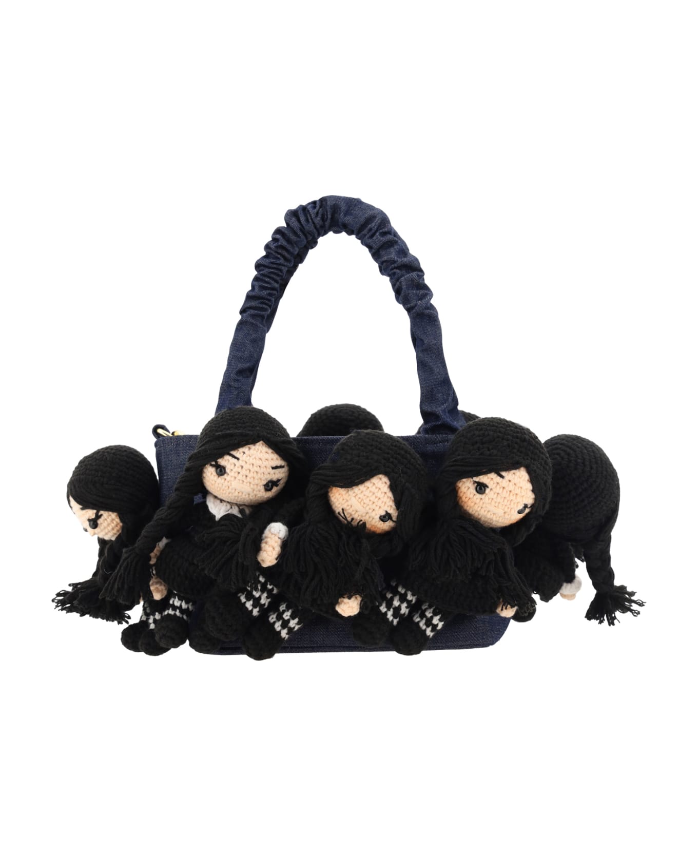 Fabric wednesday handbag by la milanesa, double top handle with ruching effect, interior snap button closure, denim design, all-over embossed wednesday rag dolls detail, removable fabric shoulder strap.