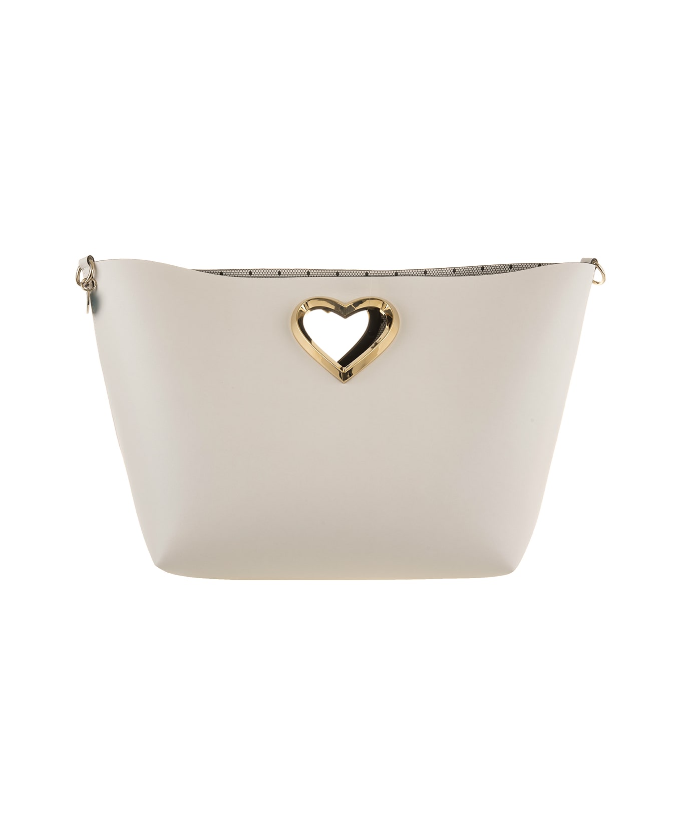 White handbag by REDValentino made of faux leather and finished with internal lining in black point d'esprit tulle and with a heart-shaped cut-out handle with gold trim. Boxy model featuring a open design, back gold-tone logo print, a single interior compartment, a flat interior logo pocket and a detachable, adjustable shoulder strap. 47x27x18 cm