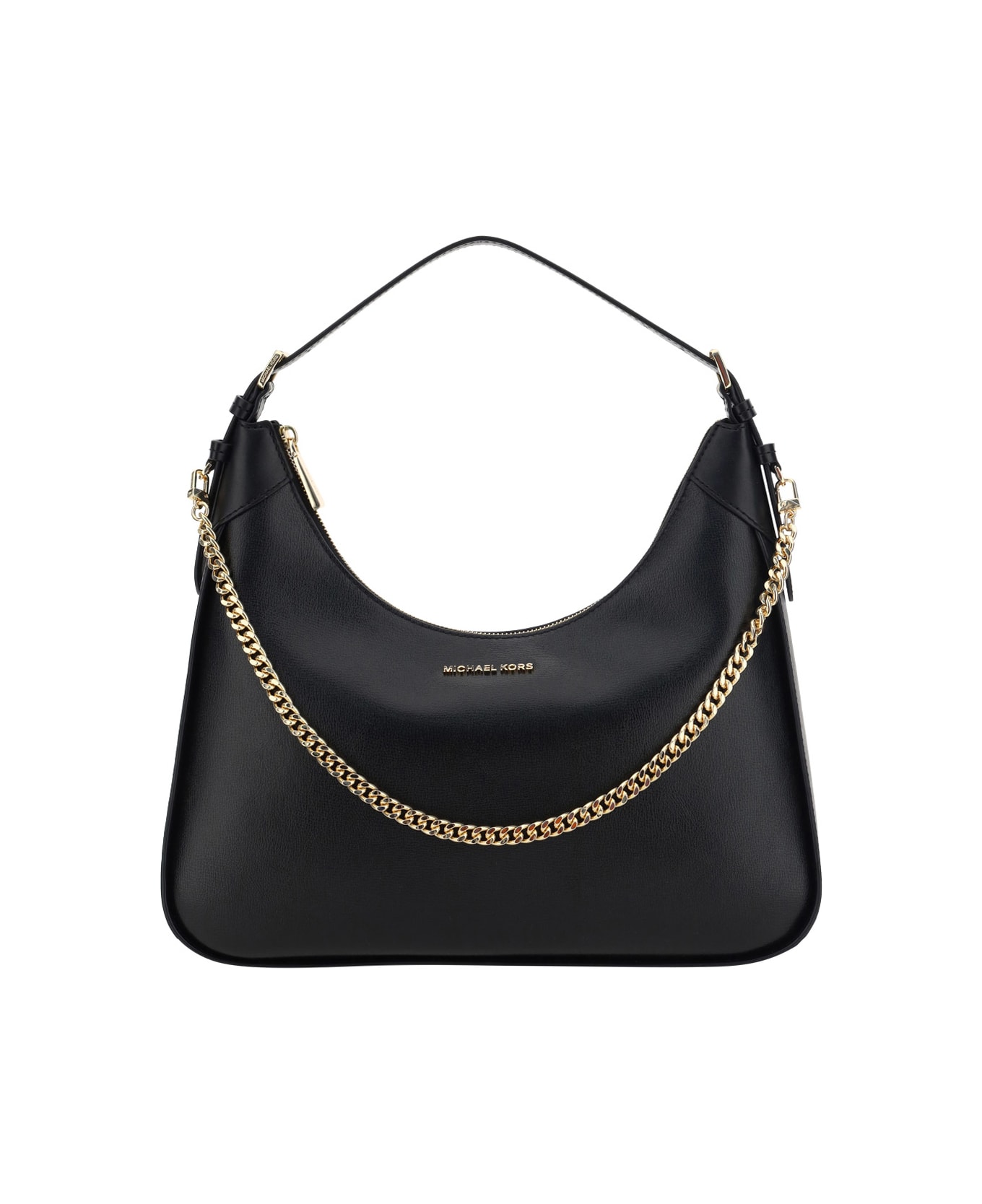 Calfskin wilma shoulder bag by michael kors, zippered top closure, adjustable flat leather shoulder strap, gold-plated second chain strap, embossed iconic brand monogram plaque on front, single interior compartment, interior welt pocket.