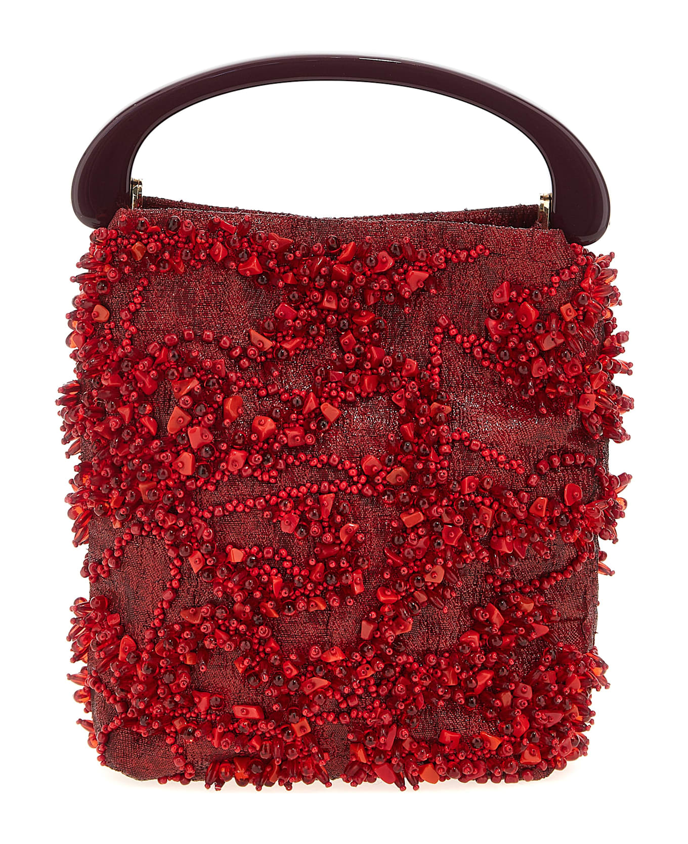 'W. L. ' fabric handbag with beads applied, leather lining, magnetic closure, rigid resin handle, adjustable and removable patent leather shoulder strap.