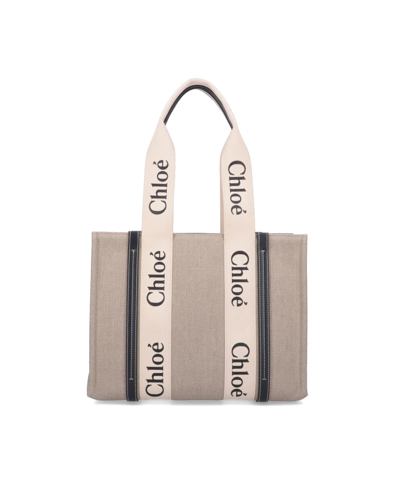 Chloe' 'Woody' Medium Tote Bag, beige linen, black leather details, cream logo top handles, one interior flat pocket, one interior main compartment. Composition: -, 100% Linen