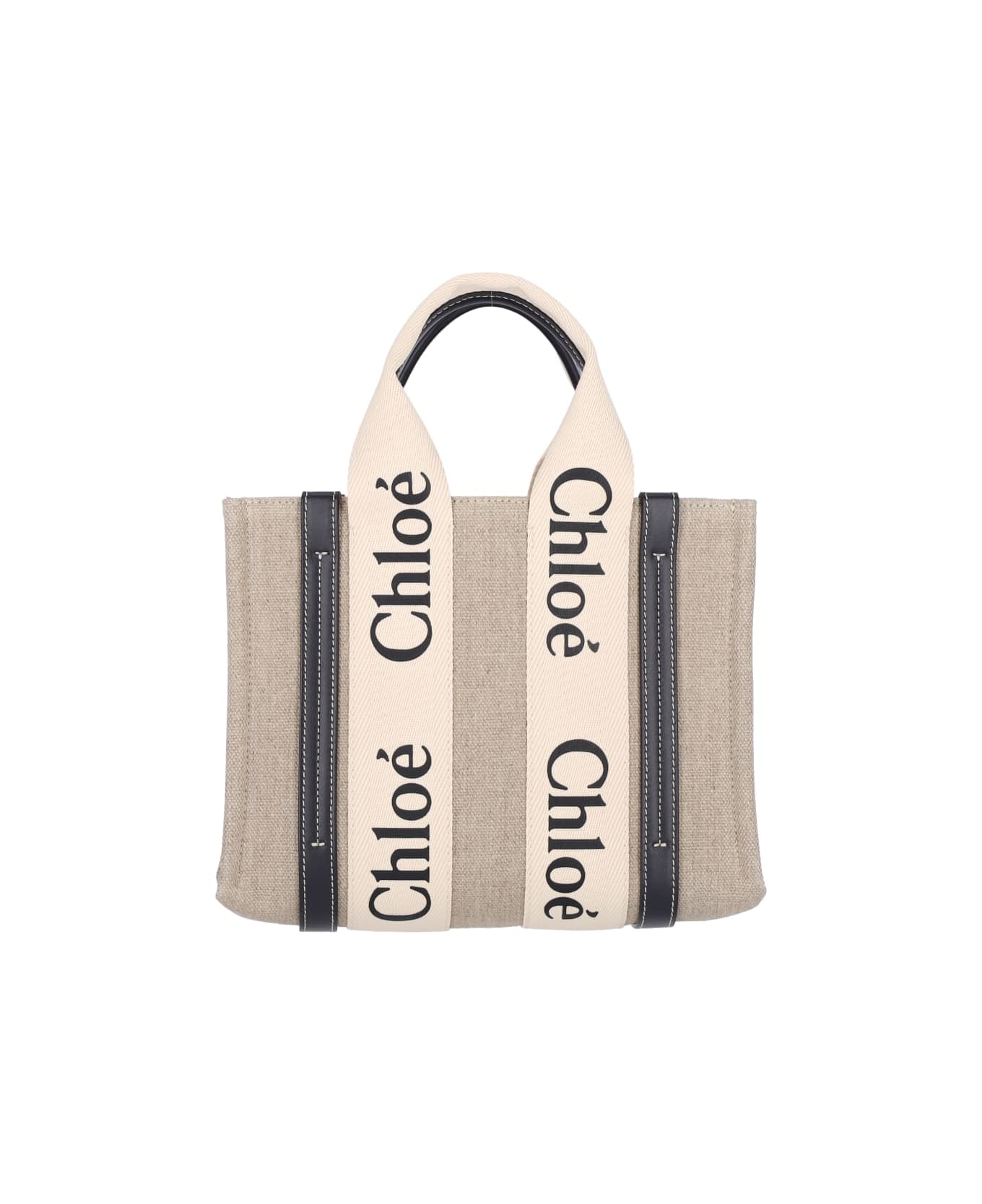 Chloé 'Woody' Small Tote Bag, canvas, beige colour, black leather details, two top handles, adjustable and removable shoulder strap, side logo print ribbon detail, one main internal compartment, one internal flat pocket. Autumn Winter 2022 2023, women's Composition: 100% Canvas