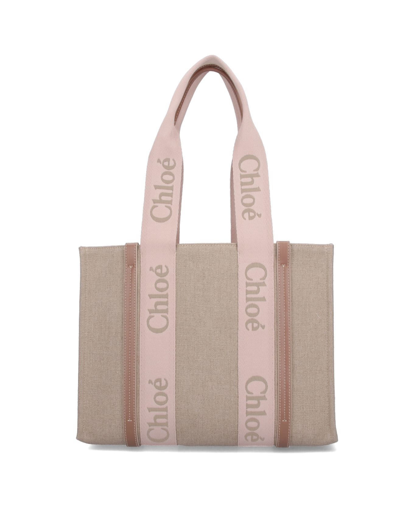 Chloé Woody tote bag in beige linen with leather trim, two pink handles, tone-on-tone logo embroidery pattern, interior flat pocket, one interior compartment. Composition: 100% Linen