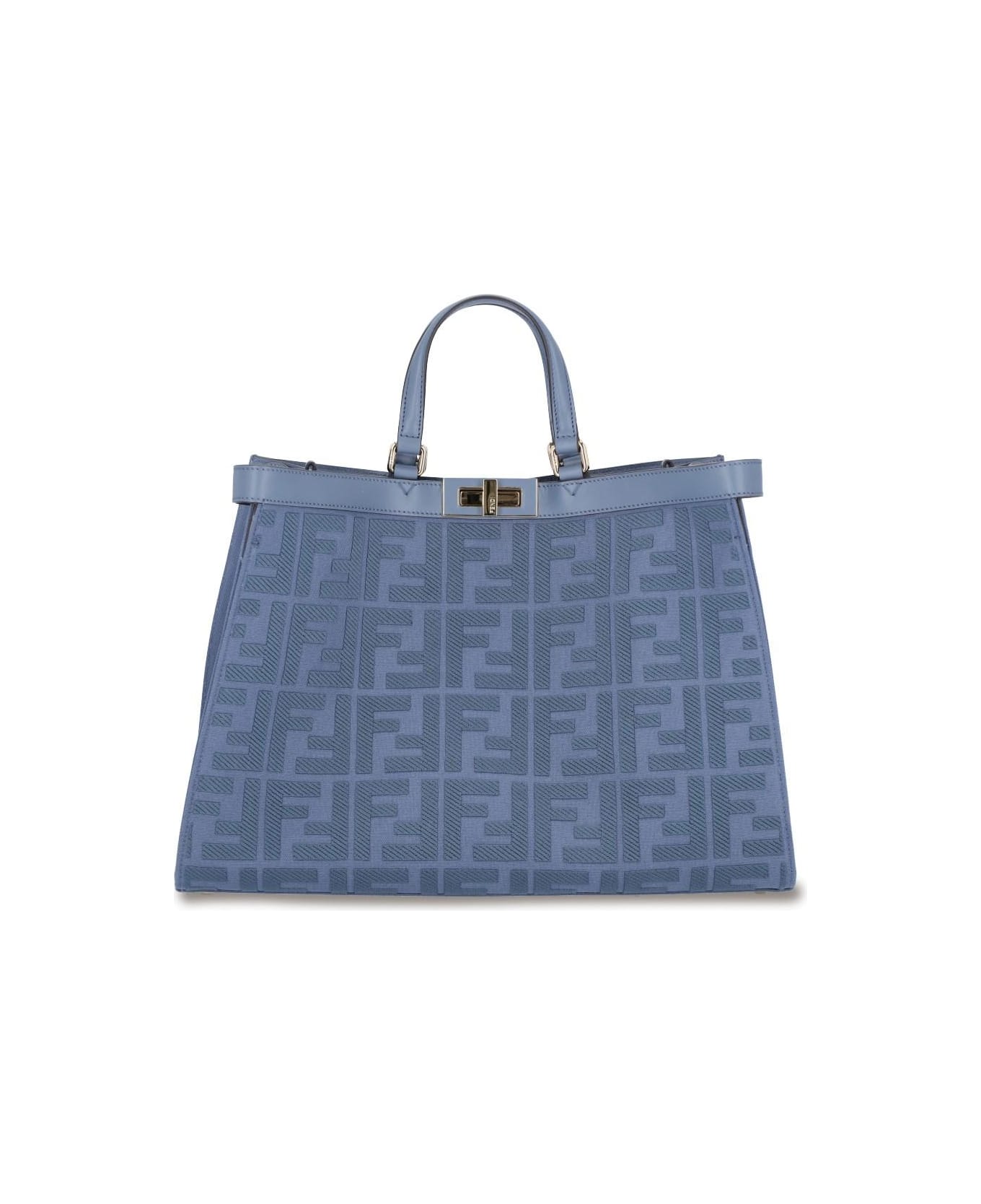 Fendi 'X-Tote' blue fabric midi tote bag with embossed logo pattern at the front, tonal leather trims, gold metal turn lock closure, two short top handles, two long handles, inner snap button pocket, main inner compartment.