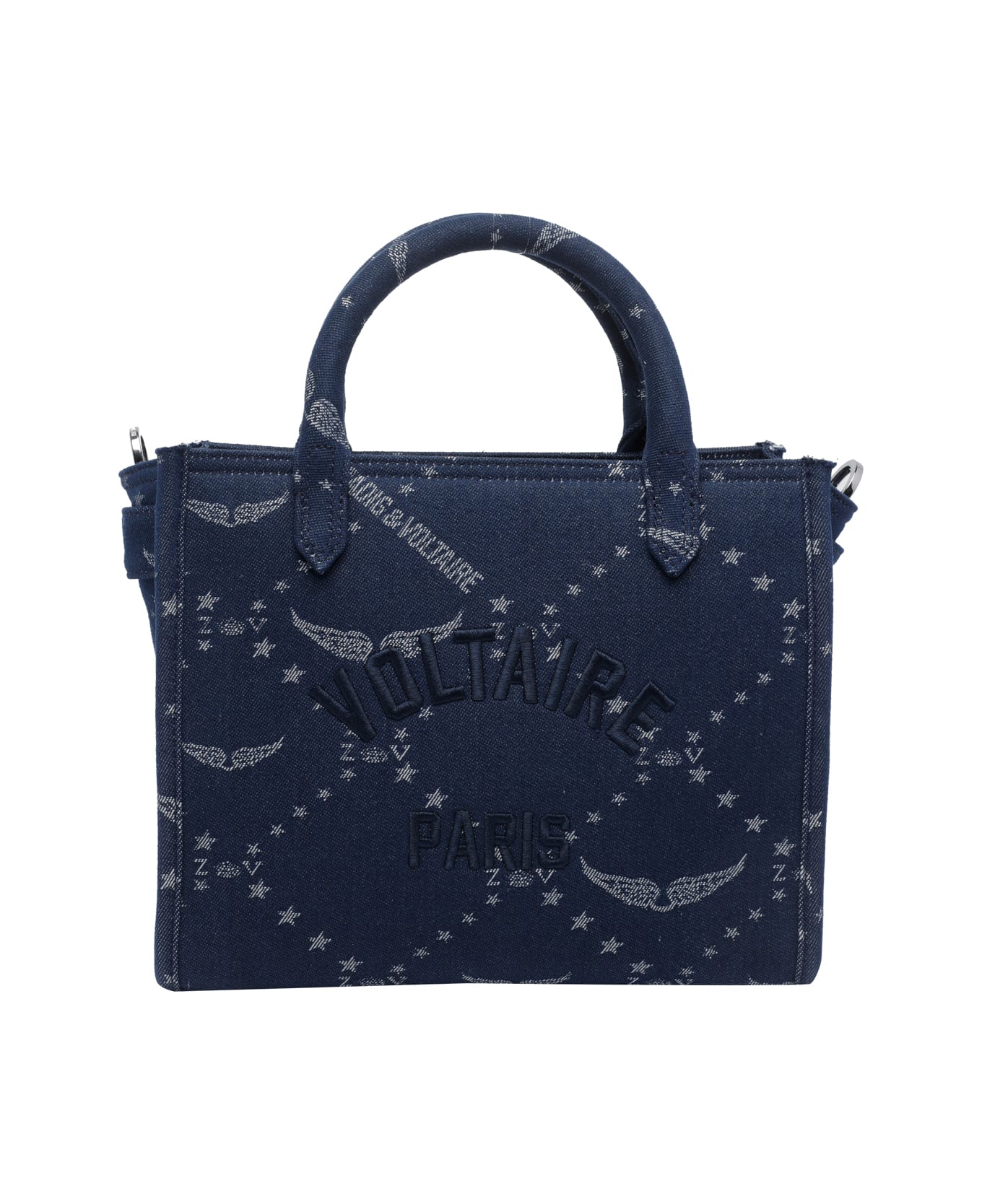 Zadig&Votlaire blue denim Angel tote bag, zip closure, embroidered logo on the front, zip closure, one inner zip pocket and one open pocket, 2 handles, adjustable and removable shoulder strap, monogram logo