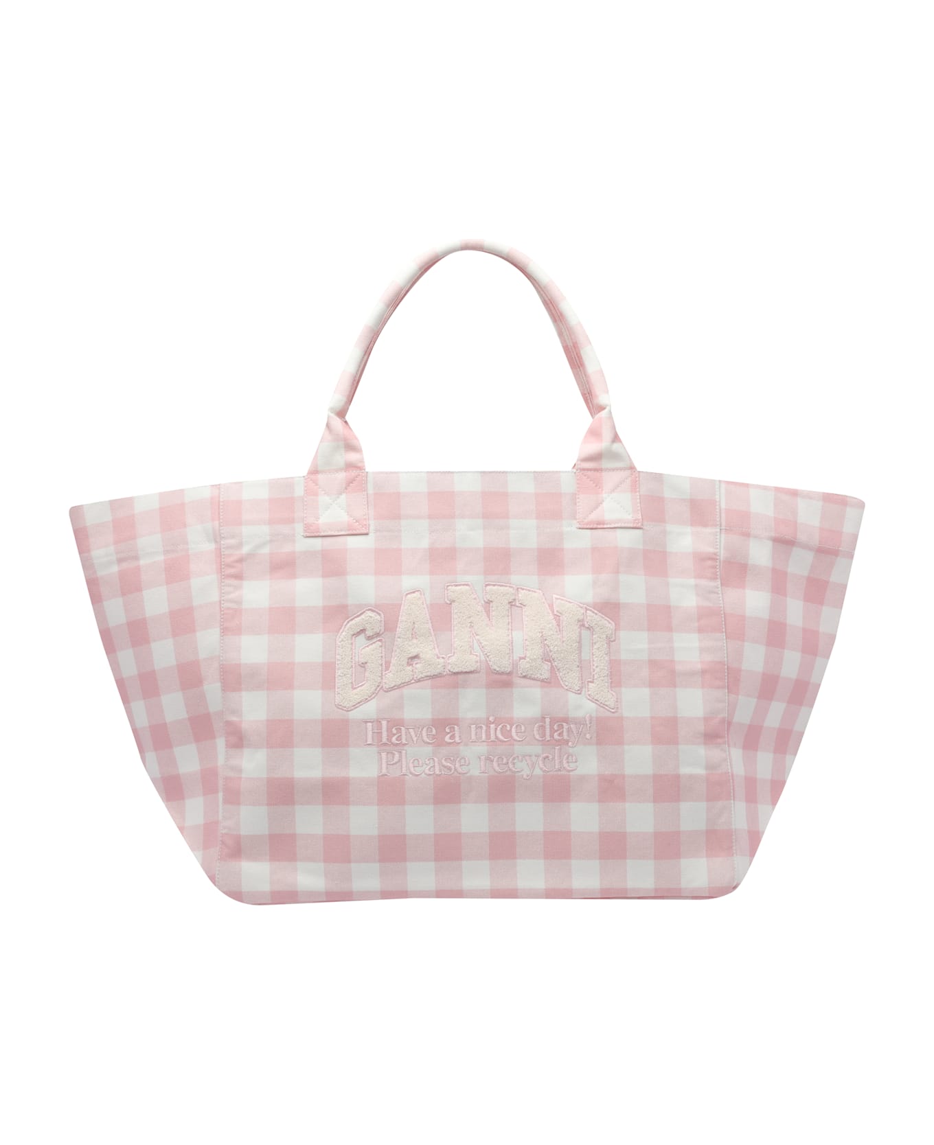 Ganni pink shopper bag, 2 inner open pockets, frontal logo, 2 inner open pockets and one with zip, 2 handles, check motif Composition: 100% Cotton