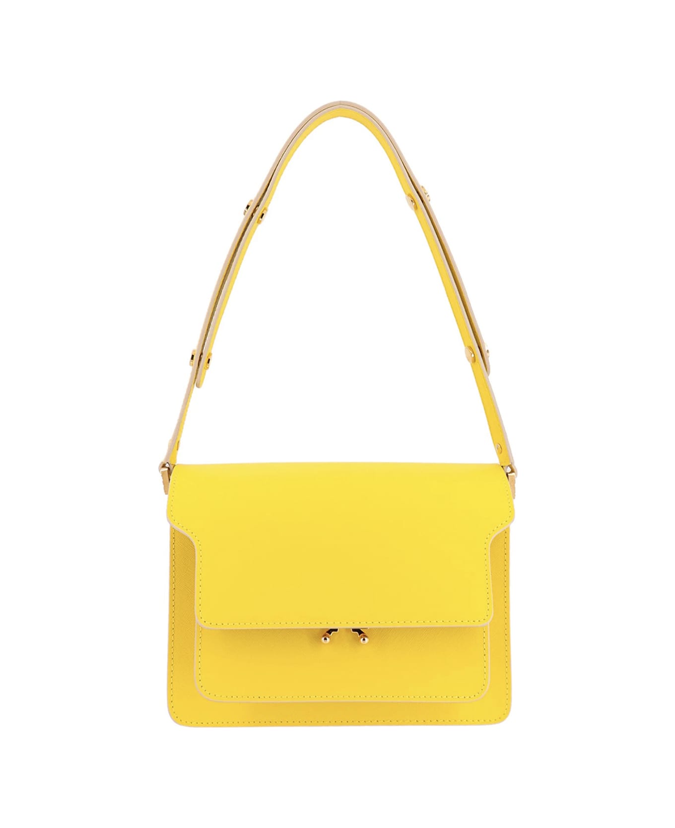 Yellow Trunk medium bag by Marni made of shiny calf leather and featuring fabric lining, a push-lock closure, gold-tone metal hardware, a back pocket, contrasting painted edges and tone-on-tone stitching. Inside: one flat pocket and five main compartments, two of which are zipped. Model with adjustable leather shoulder strap for carrying the bag on the shoulder or cross-body.