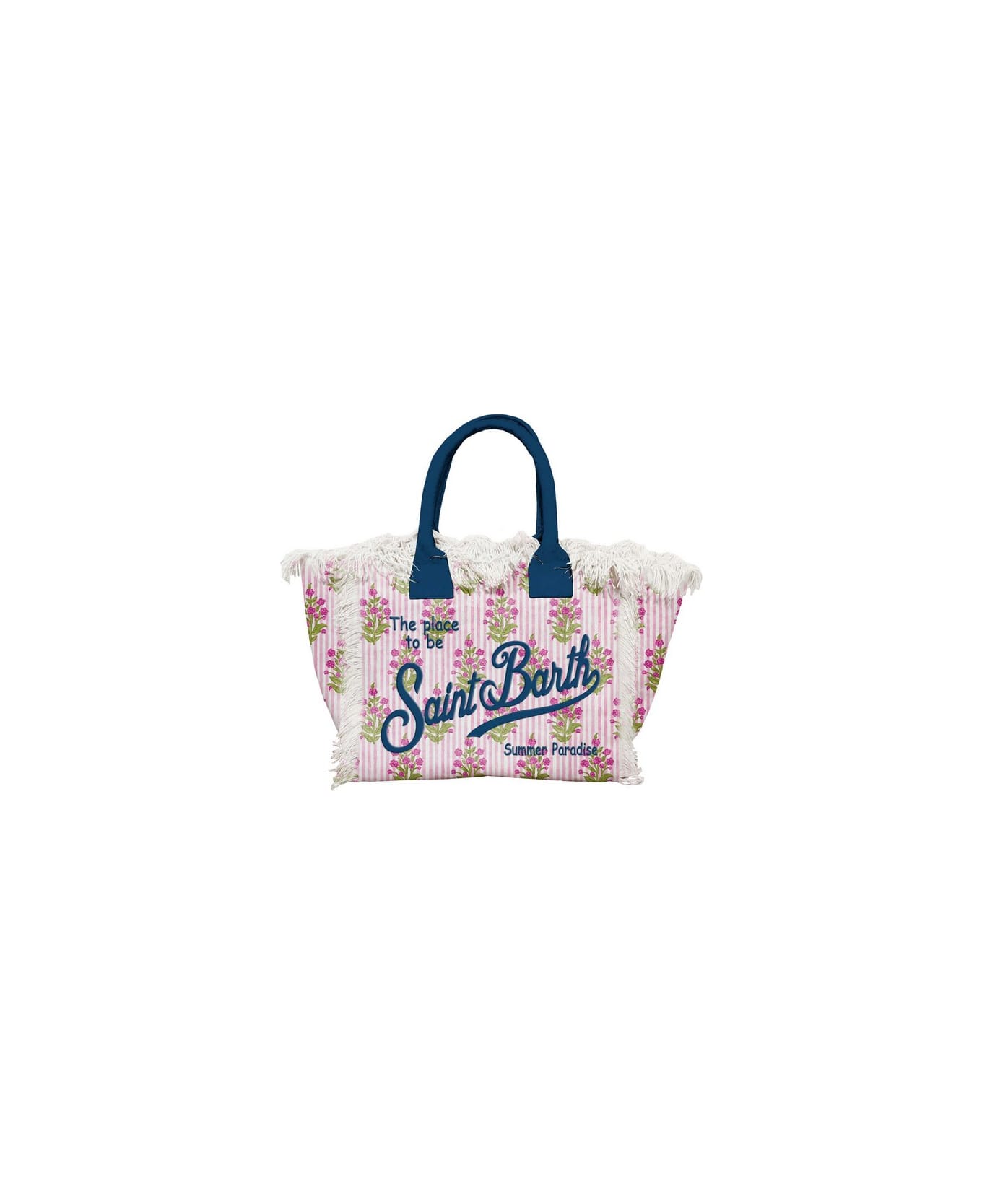 Goa floral stripes Shoulder canvas bag from MC2 St. Barth, cotton canvas material, exclusive Saint Barth printed logo, zip closure, cotton canvas fringes, internal zip pocket. Dimension:40x32x20
