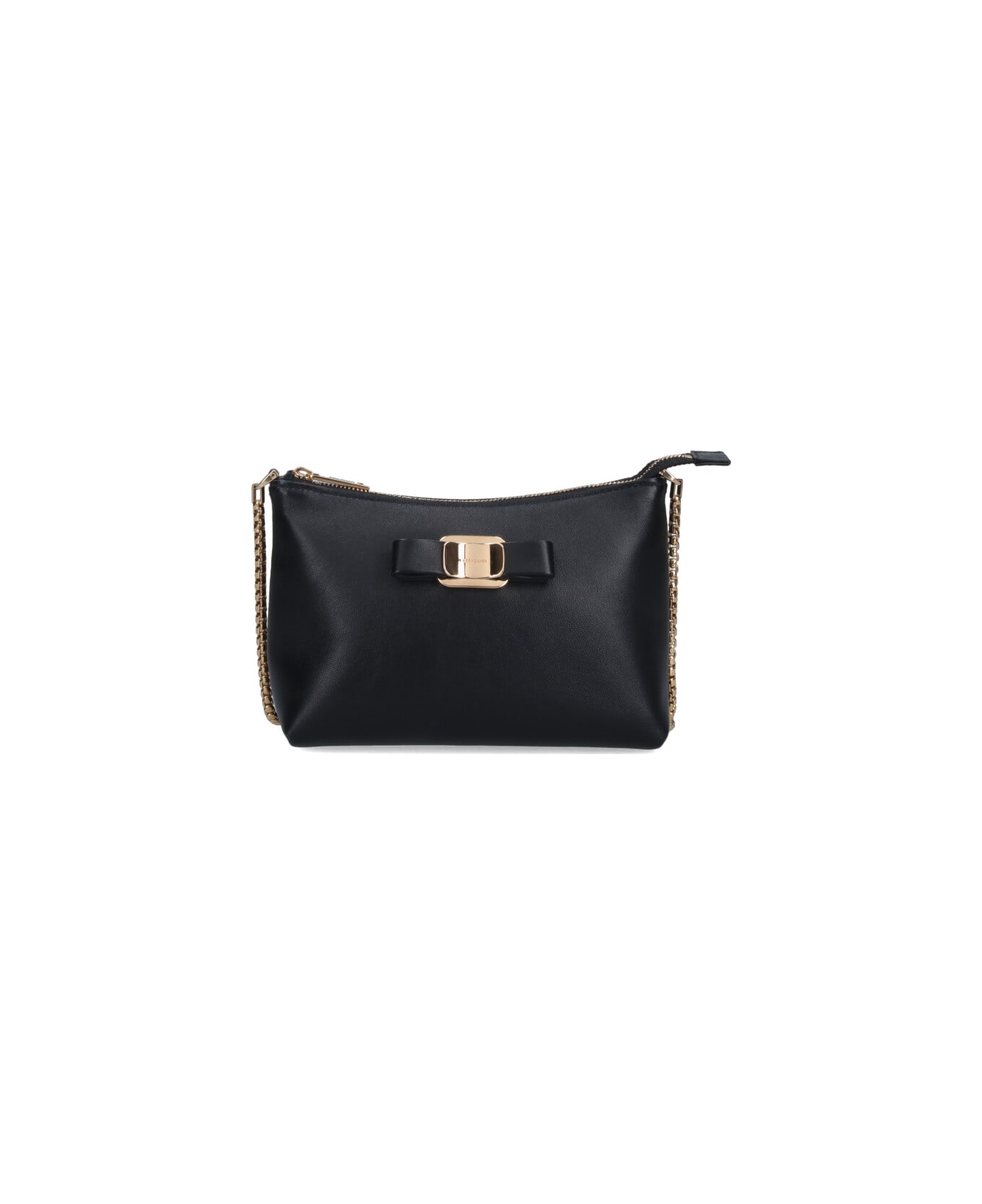 Ferragamo mini Vara bag in black leather with gold metal and leather chain shoulder strap, zip closure, bow with engraved logo on the front, two interior flat pockets, and a main inner compartment. Composition: 100% Lambskin