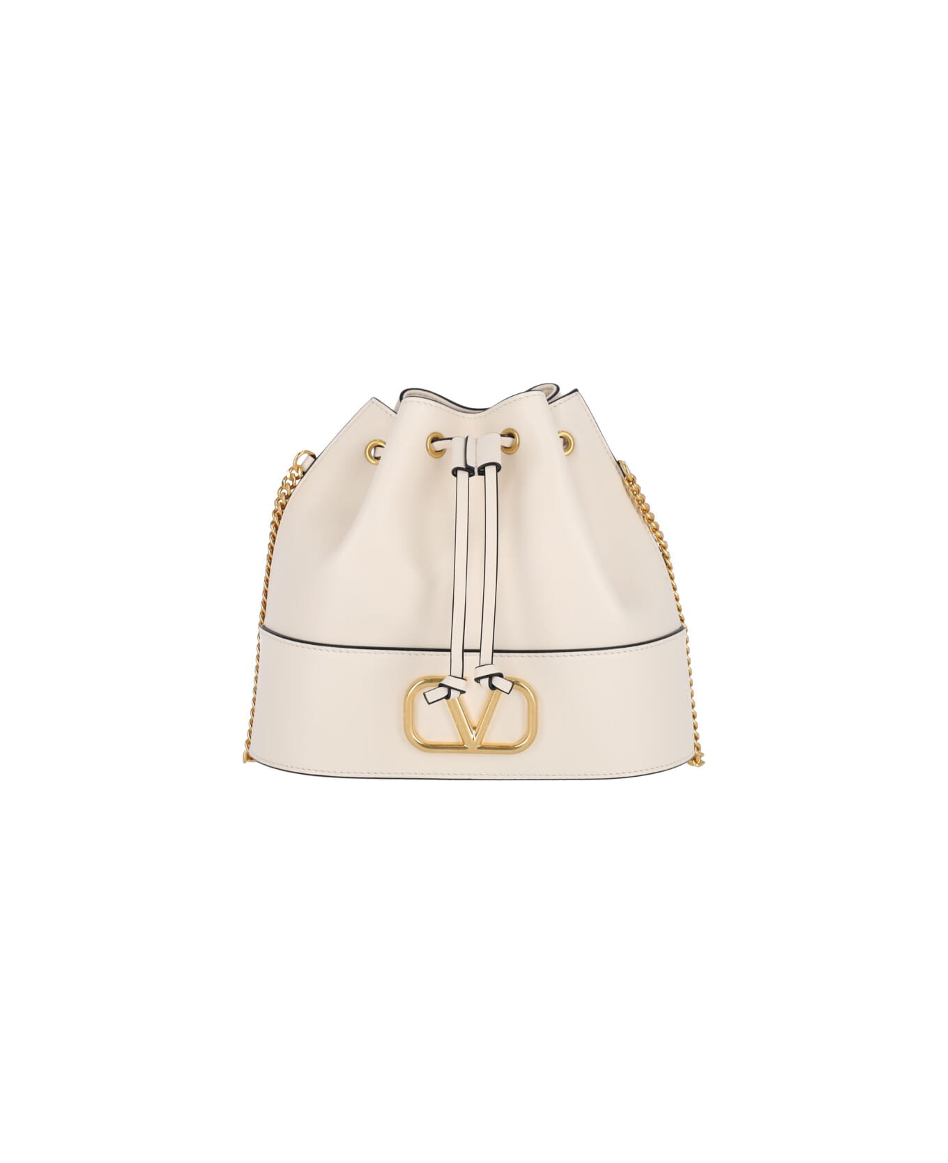 Valentino Garavani VLogo Signature mini bucket bag in white calf leather with gold metal chain shoulder strap, drawstring closure, gold metal logo on the front, and a single inner compartment. Composition: 100% Calf Leather