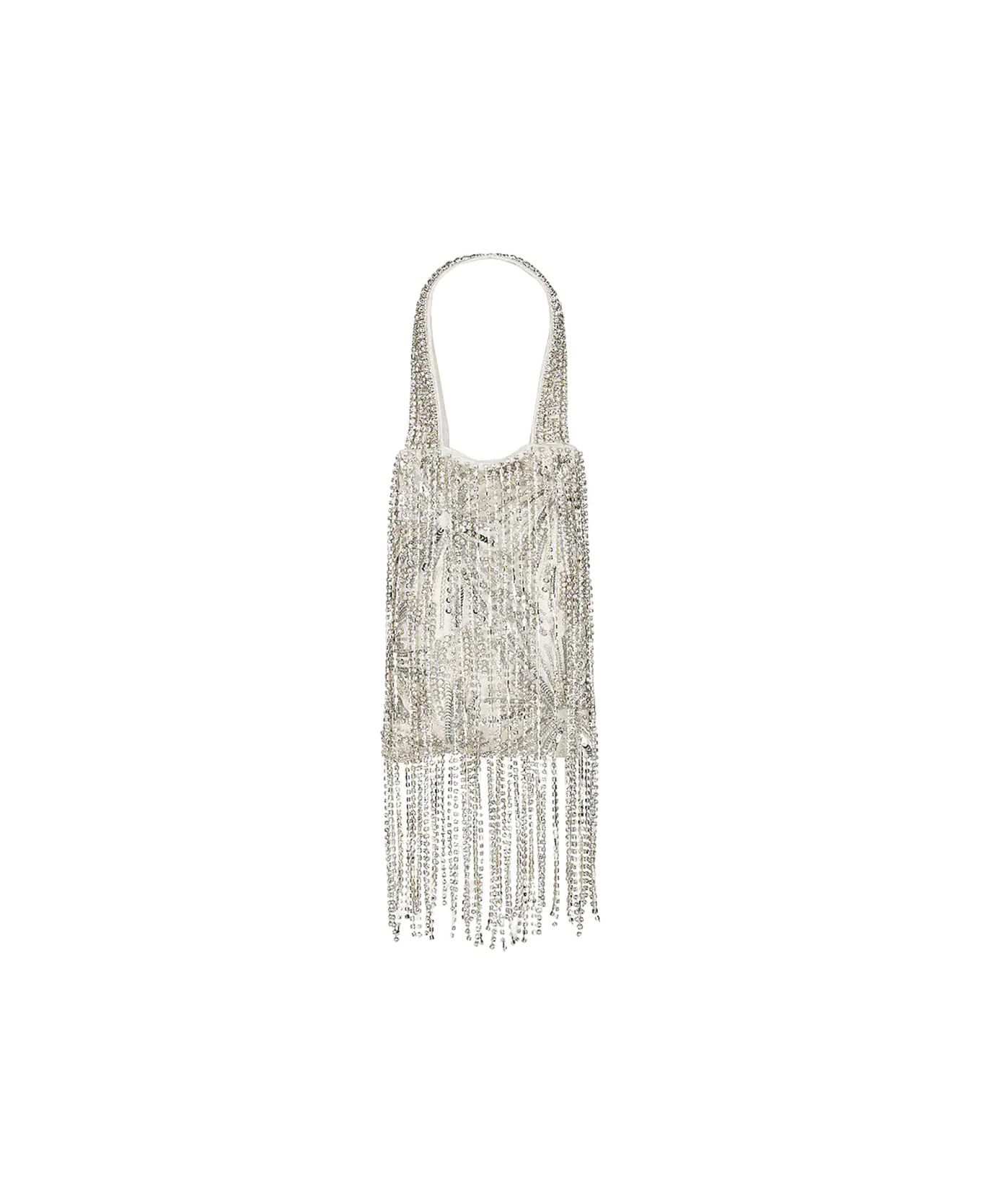 Avery bag by Retrofete made of white fabric and embellished with applications and fringes of bright silver crystals. Model with two handles, single internal compartment, open design and an internal bellows pocket.