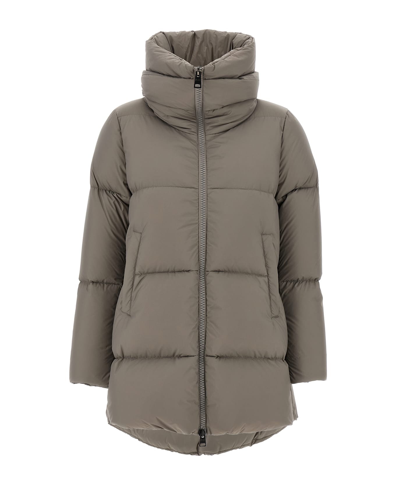 'A-Shape' quilted nylon down jacket with goose down padding, double layer high neck, front zip closure, pockets, long sleeves, side zip slits. Composition: 100% polyamide