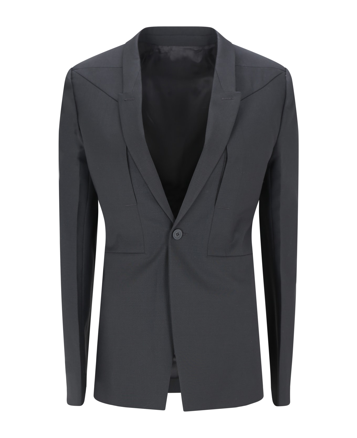 Fleece wool blazer jacket by rick owens, double-breasted front closure with button, classic lapel, two invisible welt pockets with snap button for front closure, double slit at back, structured shoulders, two side welt pockets, four inner pockets, iconic brand monogram embroidered tone on tone on lining, regular fit.