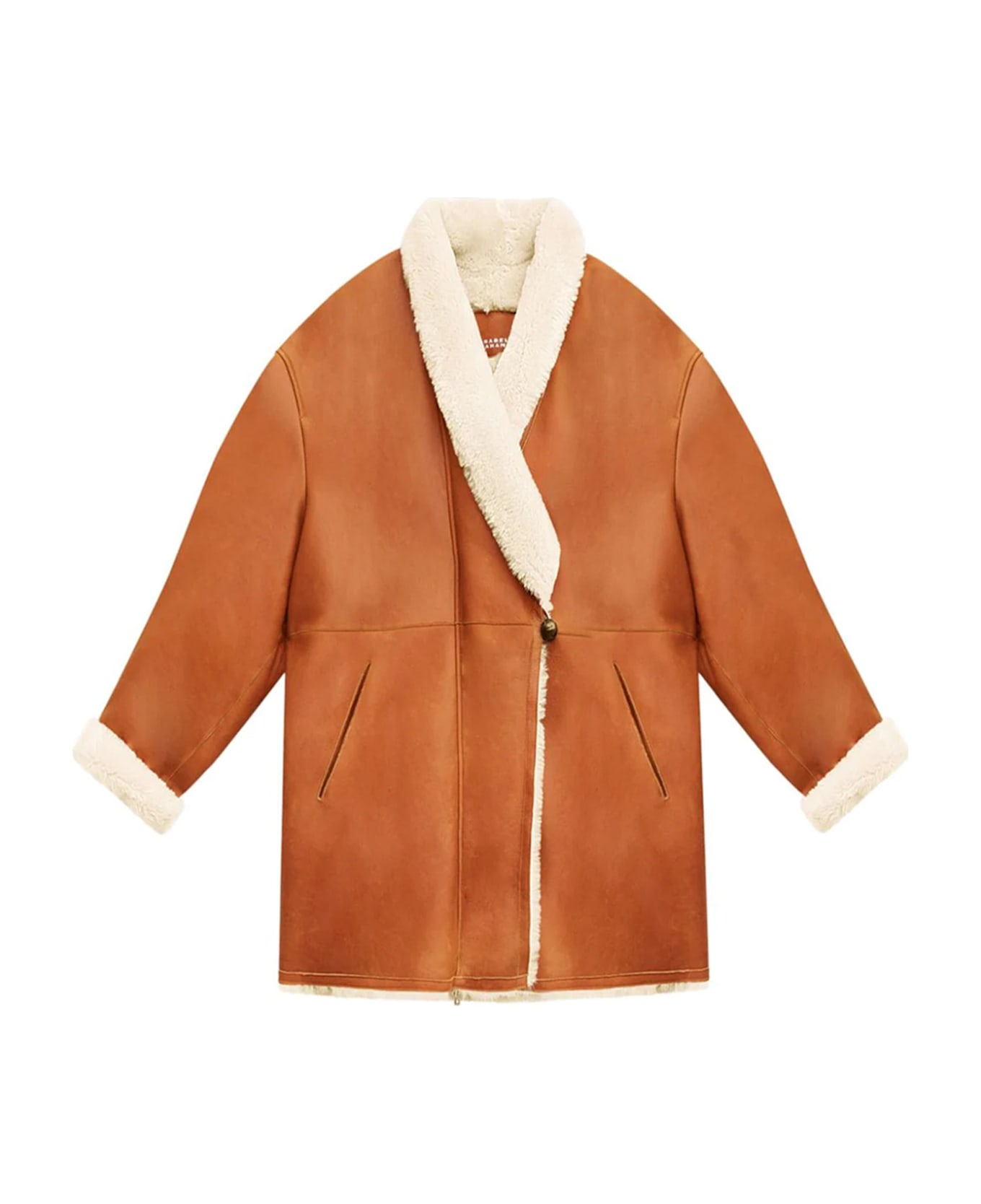 Sheepskin lining design Front closure with off-center buttons Two side pockets Long sleeves Regular fit Composition: 100% Lamb Leather