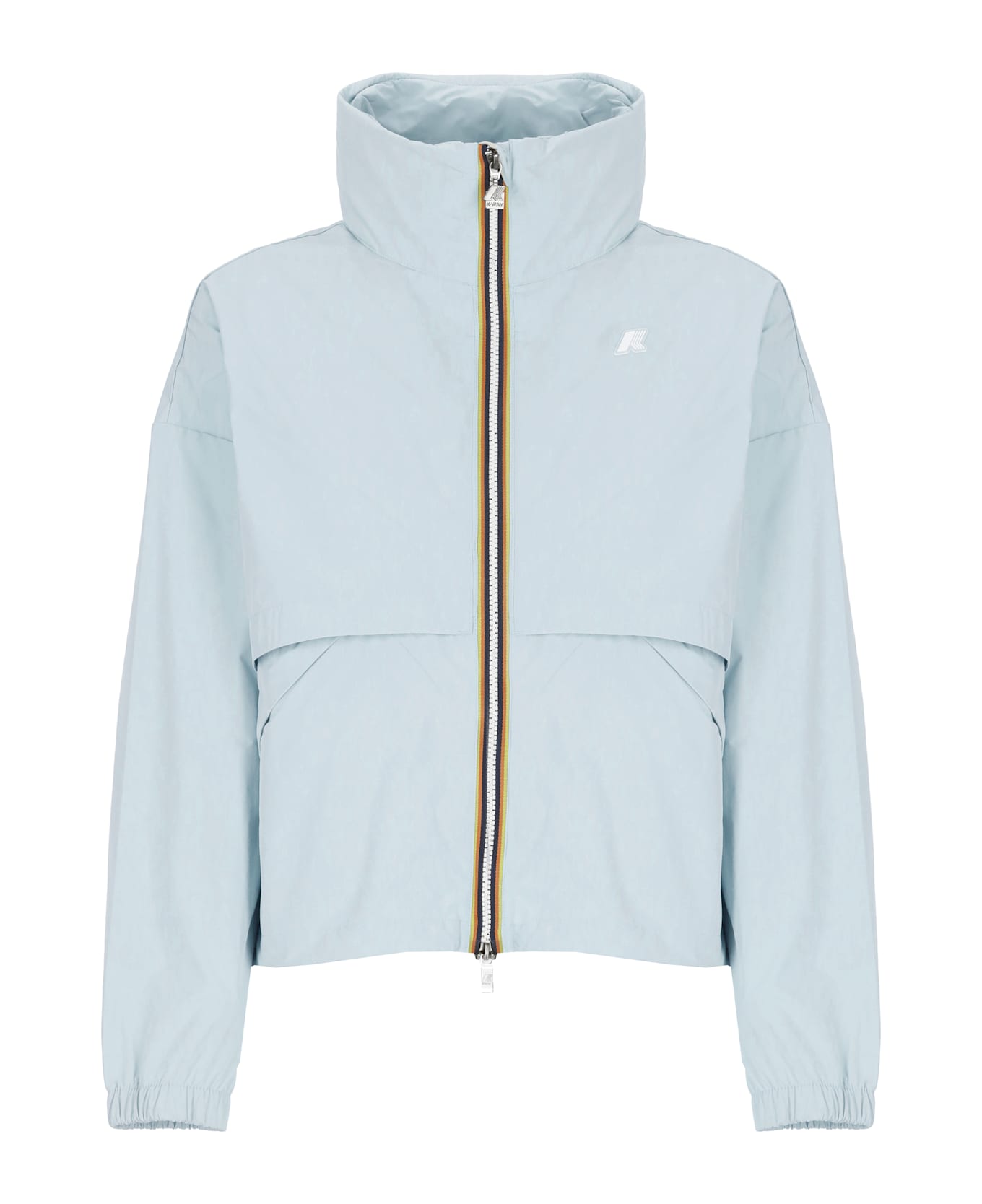 - Light blue K-Way waterproof jacket for woman - High neckline - Foldable hood - Two front slit pockets - Long sleeves - Front zip fastening - Front logo