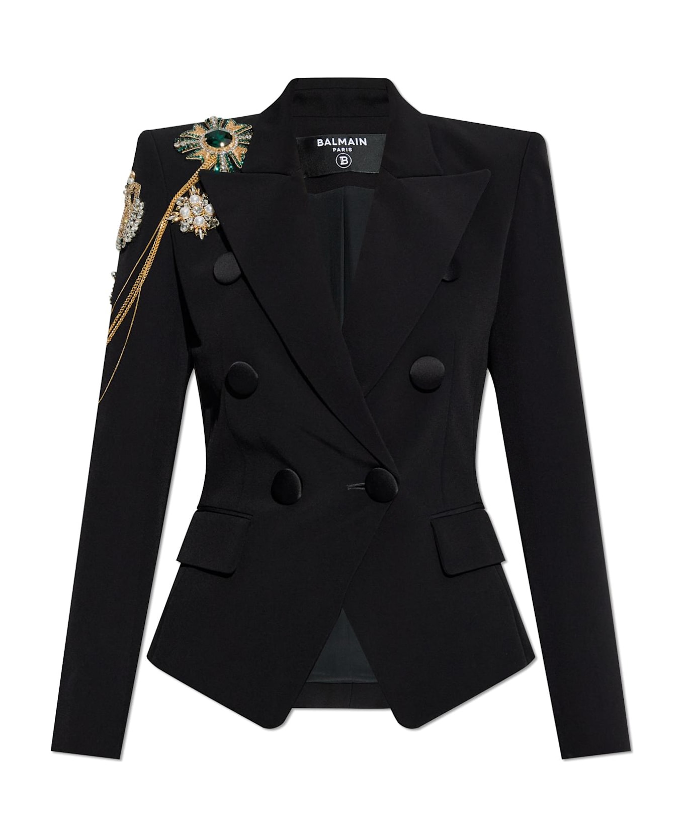 Elevate your sartorial presence with this tailored black blazer from the esteemed house of Balmain. Expertly crafted in a distinguished hourglass silhouette that accentuates the figure, it features wide, sculpted shoulders and bold, double-breasted lapels for an unmistakably refined statement. The substantial black fabric buttons draw the eye, while the shimmering embellishments on the shoulder lend the piece a modern edge. Impeccably constructed, the outer layer is pure viscose, exuding a subtle luster and resilient structure. Inside, a luxurious lining of acetate and silk delivers incomparable comfort and breathability. A signature crest, proudly bearing the iconic