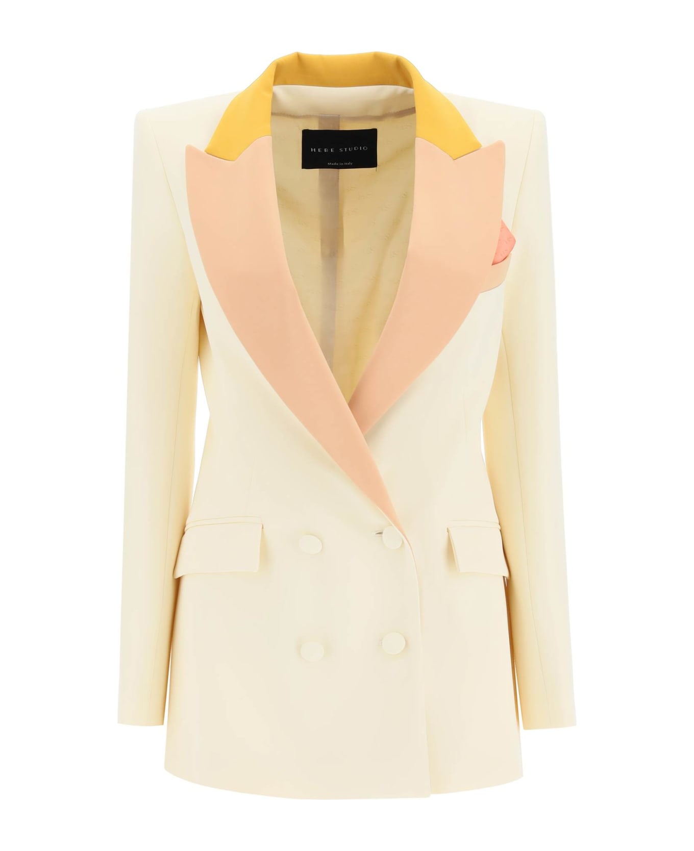 Hebe Studio double-breasted blazer in neo-crepe with contrasting details. It features a waisted silhouette with padded shoulders, four-button closure, peak lapels, flap pockets, and a chest pocket provided with a monogram silk pocket square. Finished with covered buttons and signature logo button on the left cuff. Monogram lining with an internal pocket. The model is 177 cm tall and wears a size IT 38.