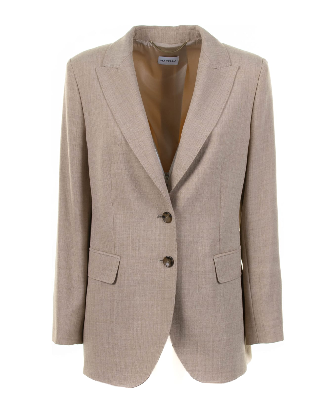 Blazer Banfy by Marella, in light brown camel malange matting. Visible button closure, flap pockets.