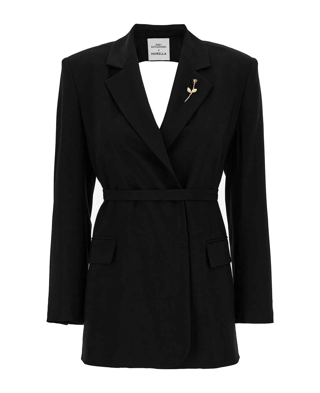 Emily Ratajkowski x Marella capsule 'The CUTOUT blazer' in wool and viscose canvas with maxi cut out detail at the back, dressing gown style with belt at the waist, mirror lapels, pockets, long sleeves, removable brooch.