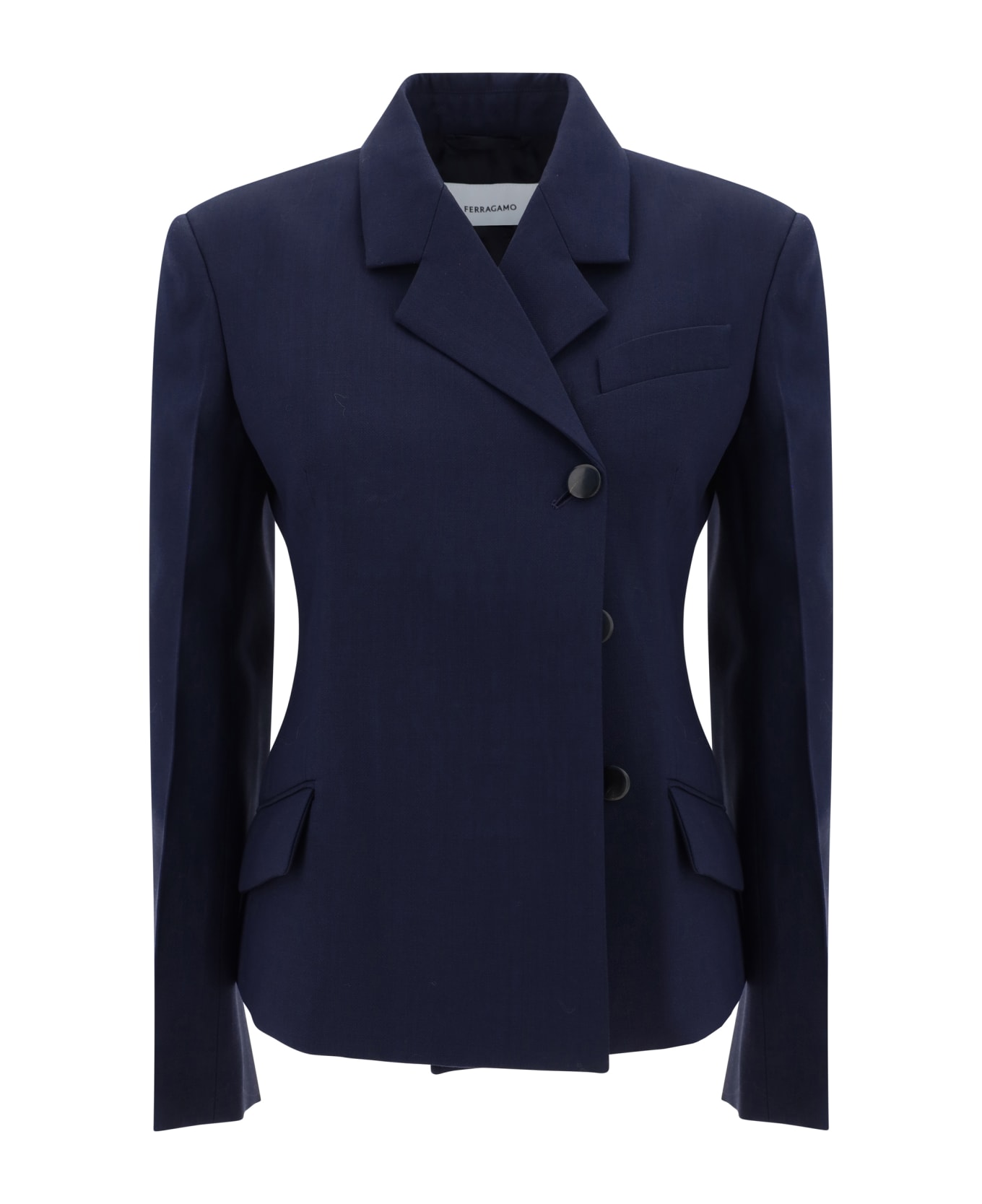 Wool blazer jacket by ferragamo, classic lapels, front button closure, two front patch flap pockets, structured padded shoulders, monochrome design, one front breast pocket, two back slits, regular fit. Composition: 100% % Wool