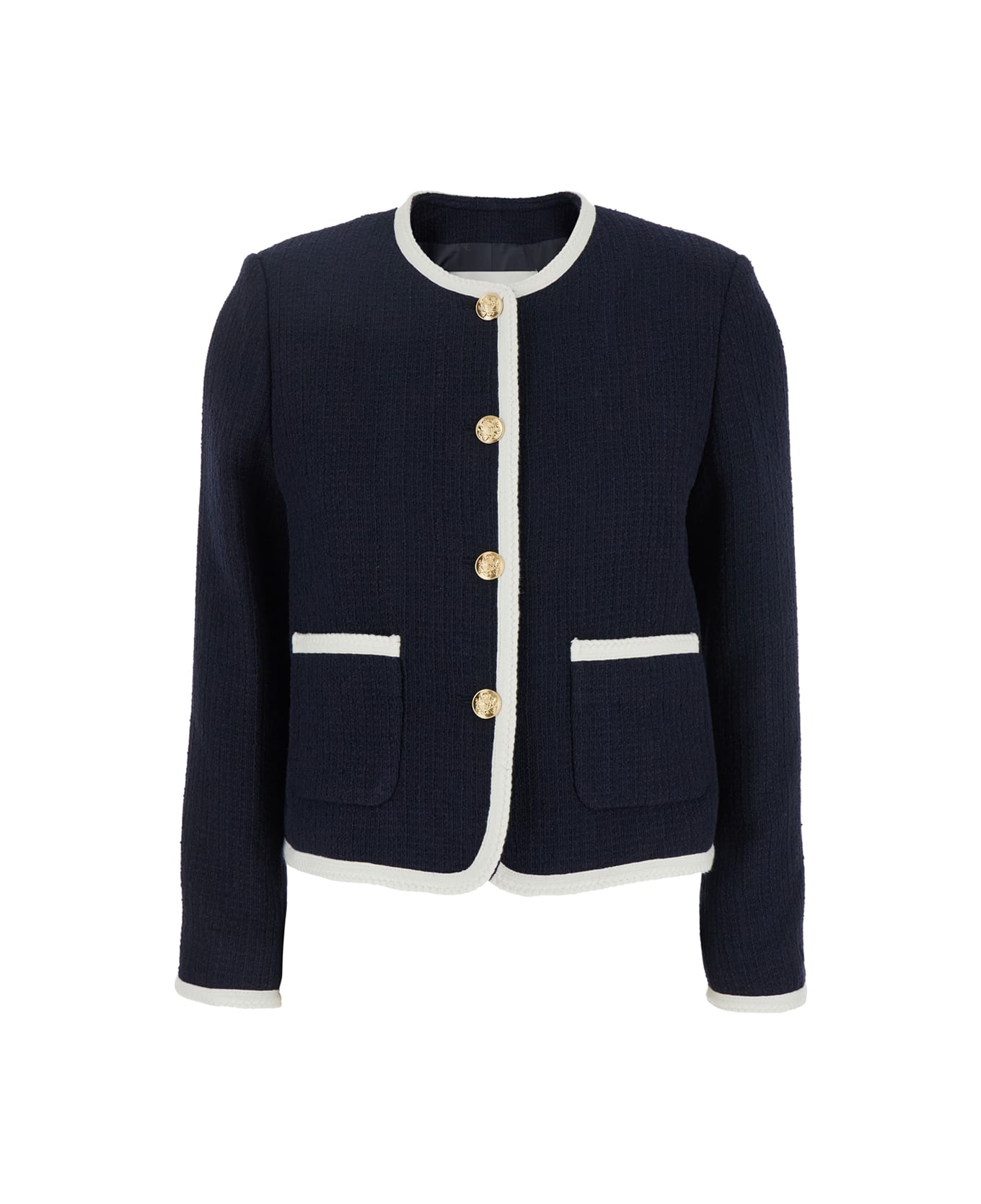 Jacket Blue Round neck Long sleeves Front jewel button closure Two front patch pockets Buttoned cuffs Straight hem Contrasting trims Cotton blend Regular fit
