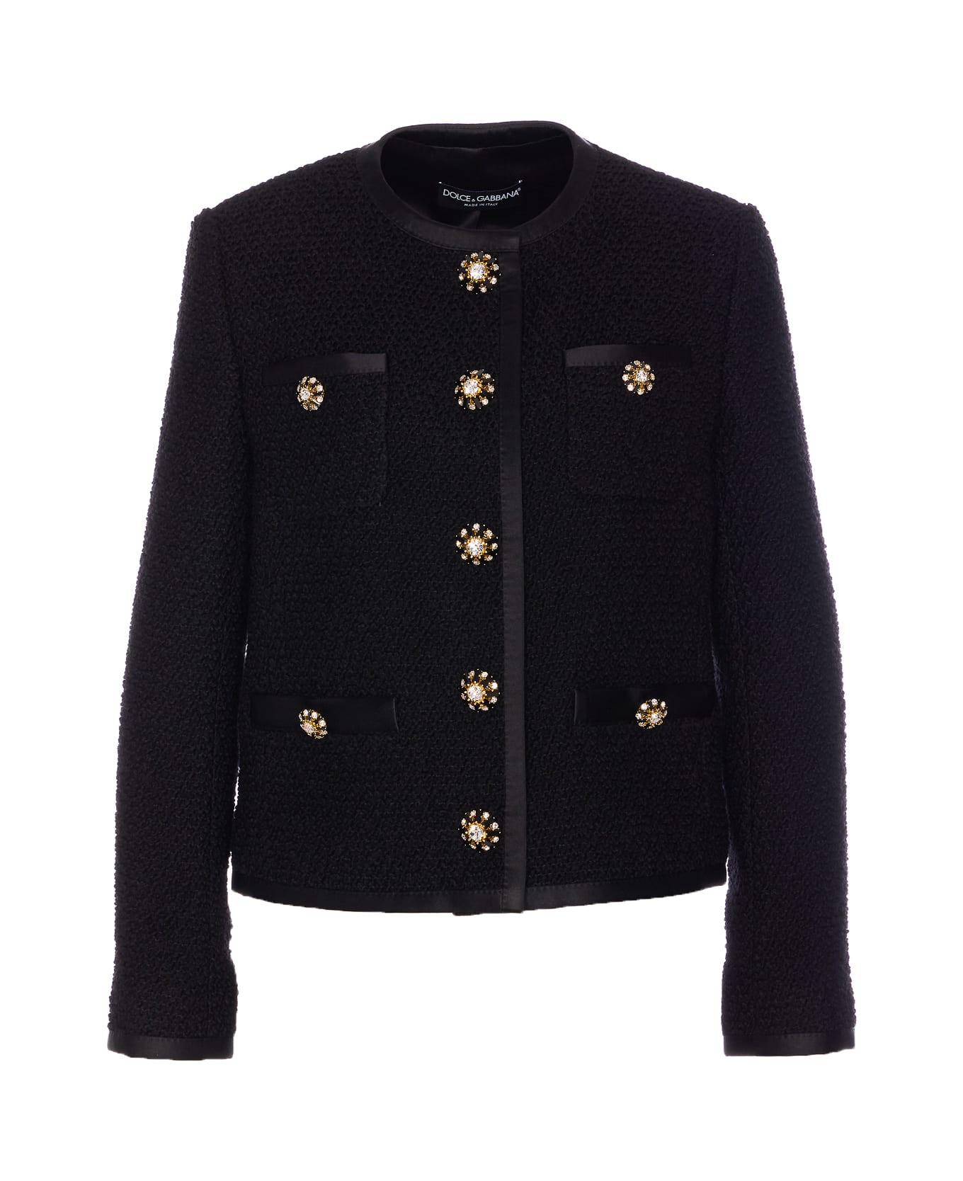 Dolce&Gabbana black tweed boucle' jacket with frontal jewelled buttons closure, crewneck, long sleeves, reinforced shoulder, jewelled buttons on cuffs Composition: 72% Virgin Wool, 18% Silk, 8% Polyamide, 2% Polyester
