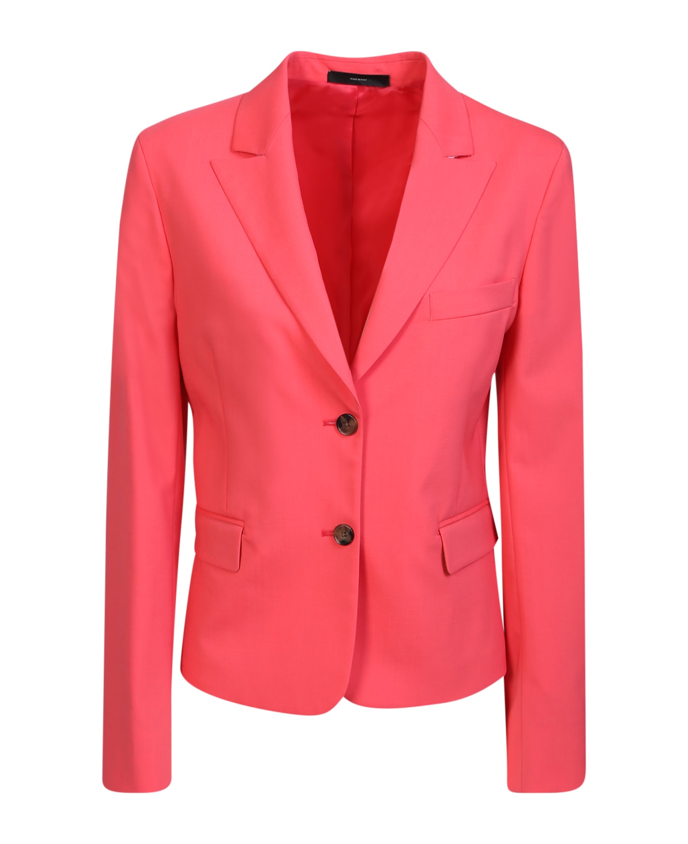 Notched lapels. Long sleeves. Front button fastening. Two welt pockets. Central rear vent. Hem with buttons. Color: Bubblegum pink
