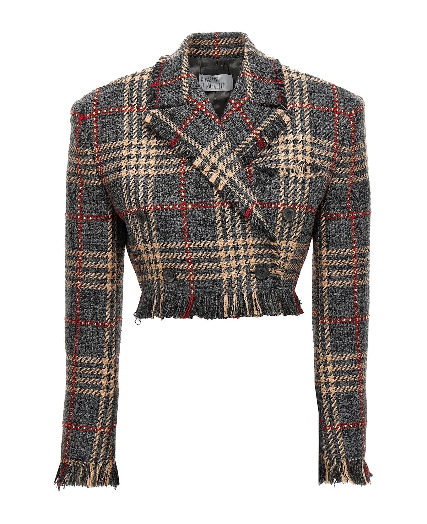 Cropped blazer in check wool blend with rhinestone appliqué, button closure, padded shoulders, long sleeves, fringes on the hem.