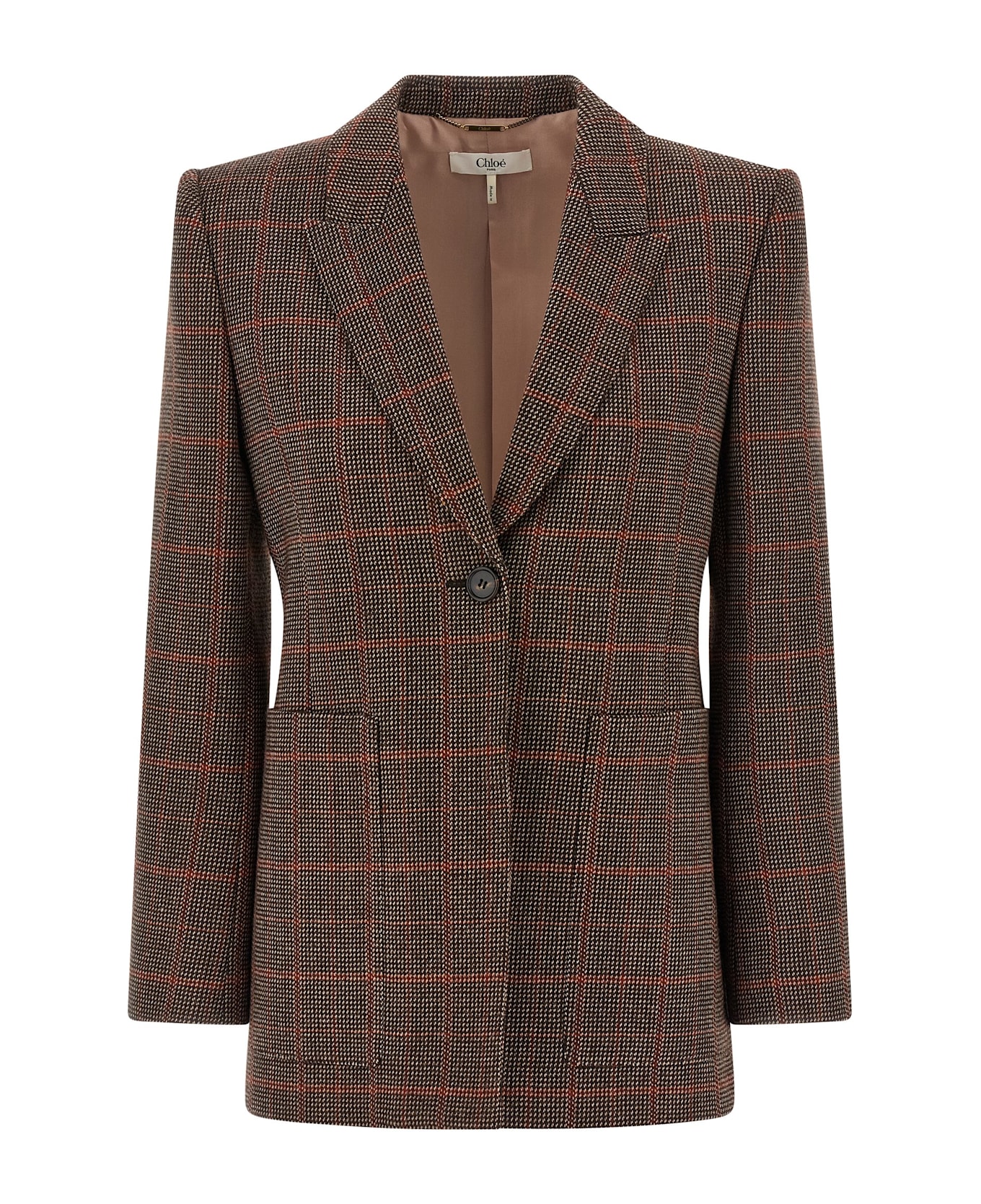 Single-breasted patterned wool blazer with front button closure, oversized patch pockets, structured shoulder strap with light toe, mirror lapels, back vents, lining. Composition: 100% wool
