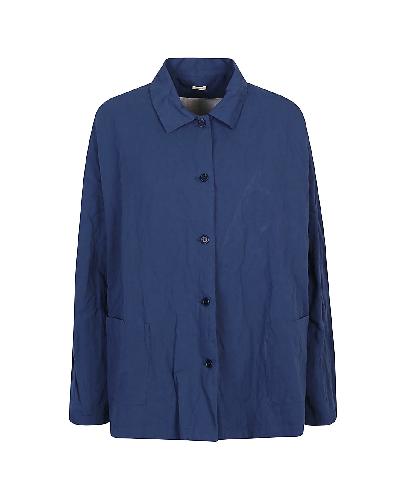 Long-sleeved jacket with front buttons, two patch pockets, pointed collar and straight hem.