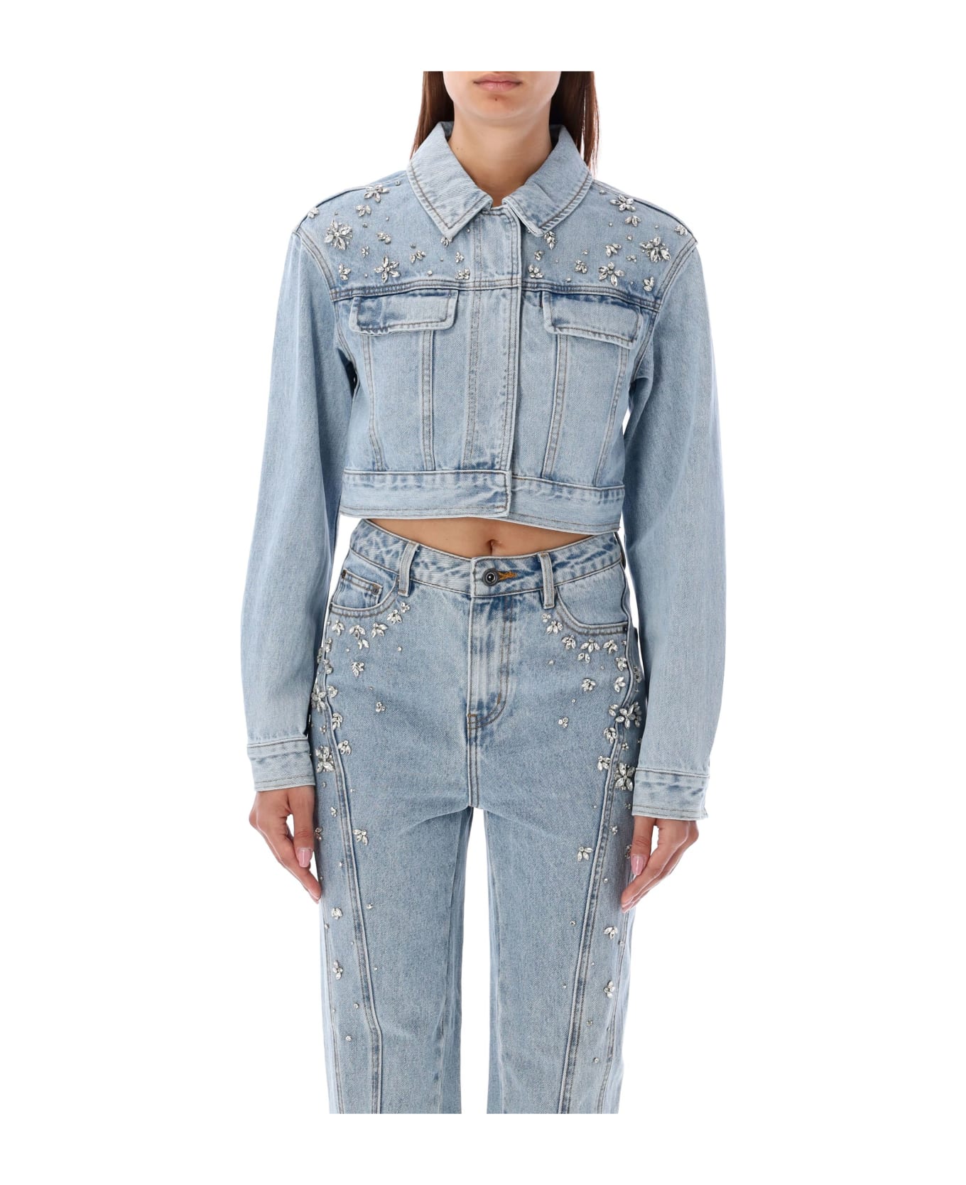 Denim Cropped Jacket Crystal By Self-portrait. Featuring: Cropped Denim Jacket Boxy Fit Snap Popper Closure Down Front Functional Pockets Long Sleeves Model Is 1,72m And Wears Size 8.