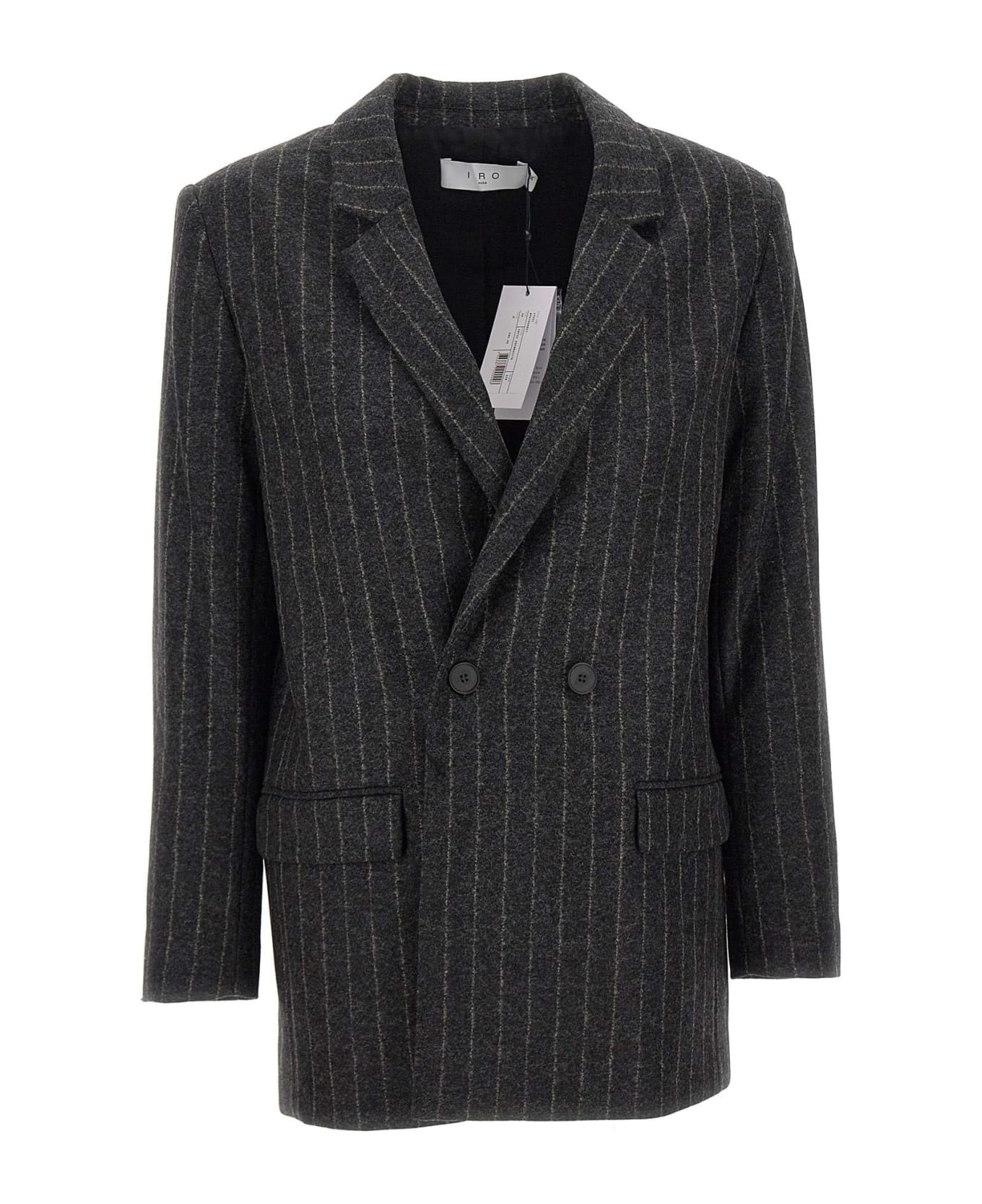 Iro "Donesi" woman wool blazer, pinstripe on smoke grey background, lapel collar, double-breasted closure with two matching buttons, two front pockets, cuffs with four buttons, cotton blend lining, comfort fit.