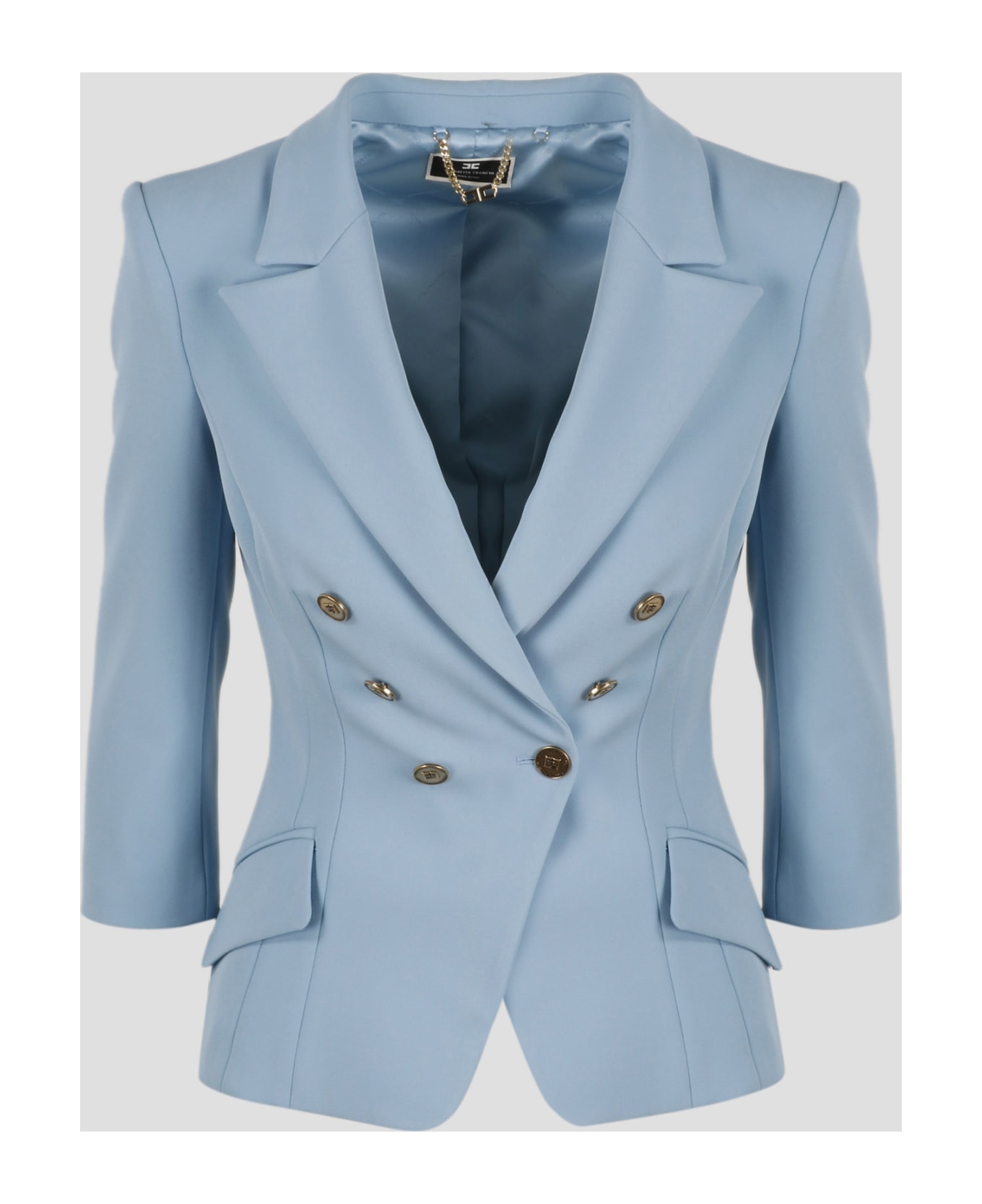 Elisabetta Franchi double-breasted blazer in stretch crêpe with wide peak lapels. - SS23 - Slim fit - Shoulder pads - ¾ sleeves - 6 antiqued gold metal buttons with EF logo - Front pockets with flap - Slit on the center back - Made in Italy - 96% Polyester, 4% Elastane