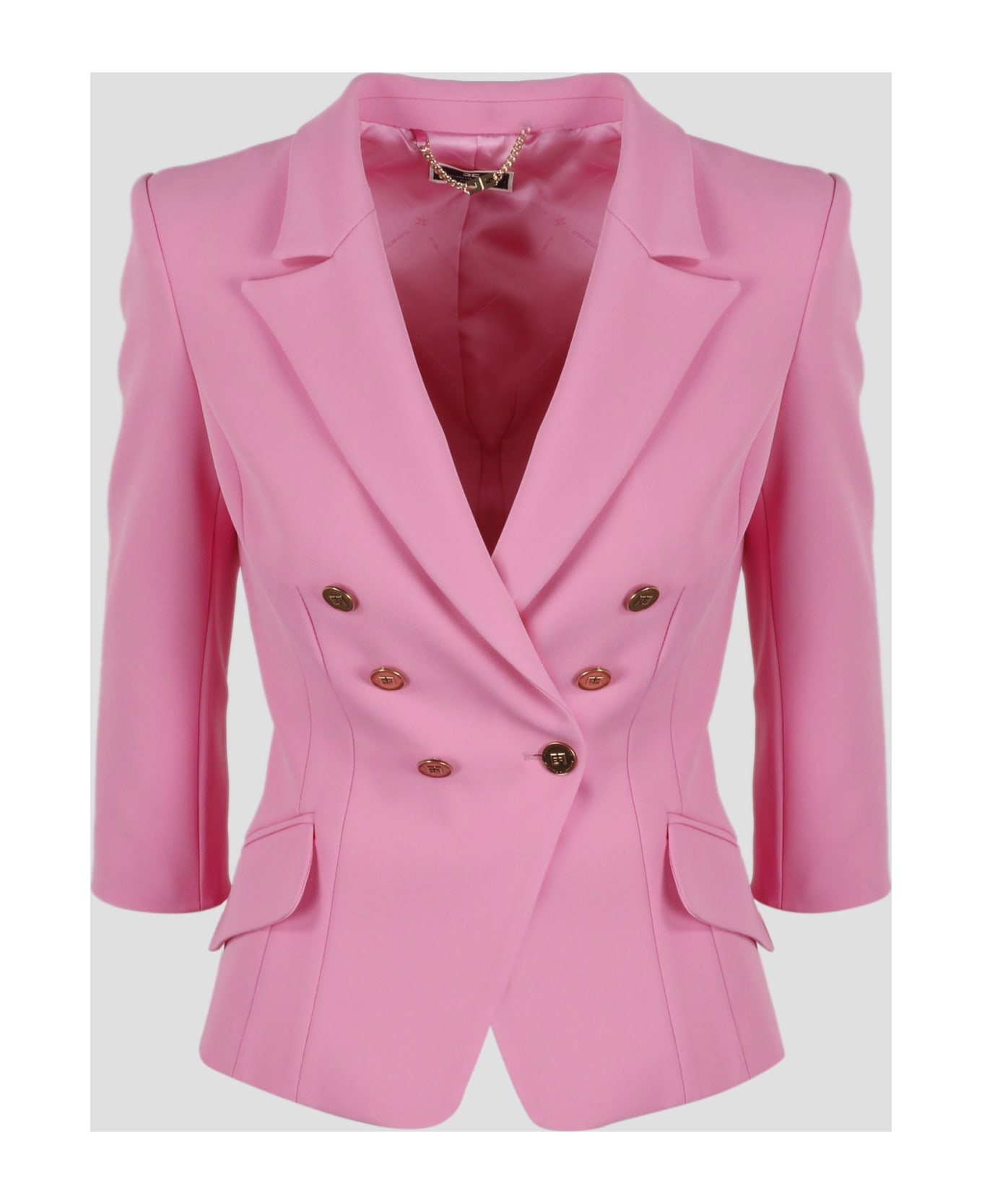 Elisabetta Franchi double-breasted blazer in stretch crêpe with wide peak lapels. - SS23 - Slim fit - Shoulder pads - ¾ sleeves - 6 antiqued gold metal buttons with EF logo - Front pockets with flap - Slit on the center back - Made in Italy - 96% Polyester, 4% Elastane