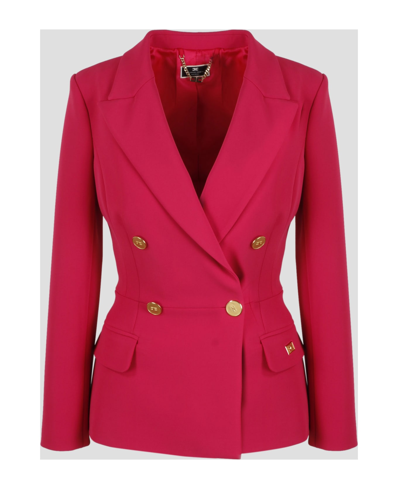 Elisabetta Franchi double-breasted blazer in stretch crêpe with peak lapels. - SS23 - Cut at the waist - 4 logged gold buttons - Long sleeves with gold buttons - Front pockets with flap - Slit on the center back - Made in Italy - 96% Polyester, 4% Elastane