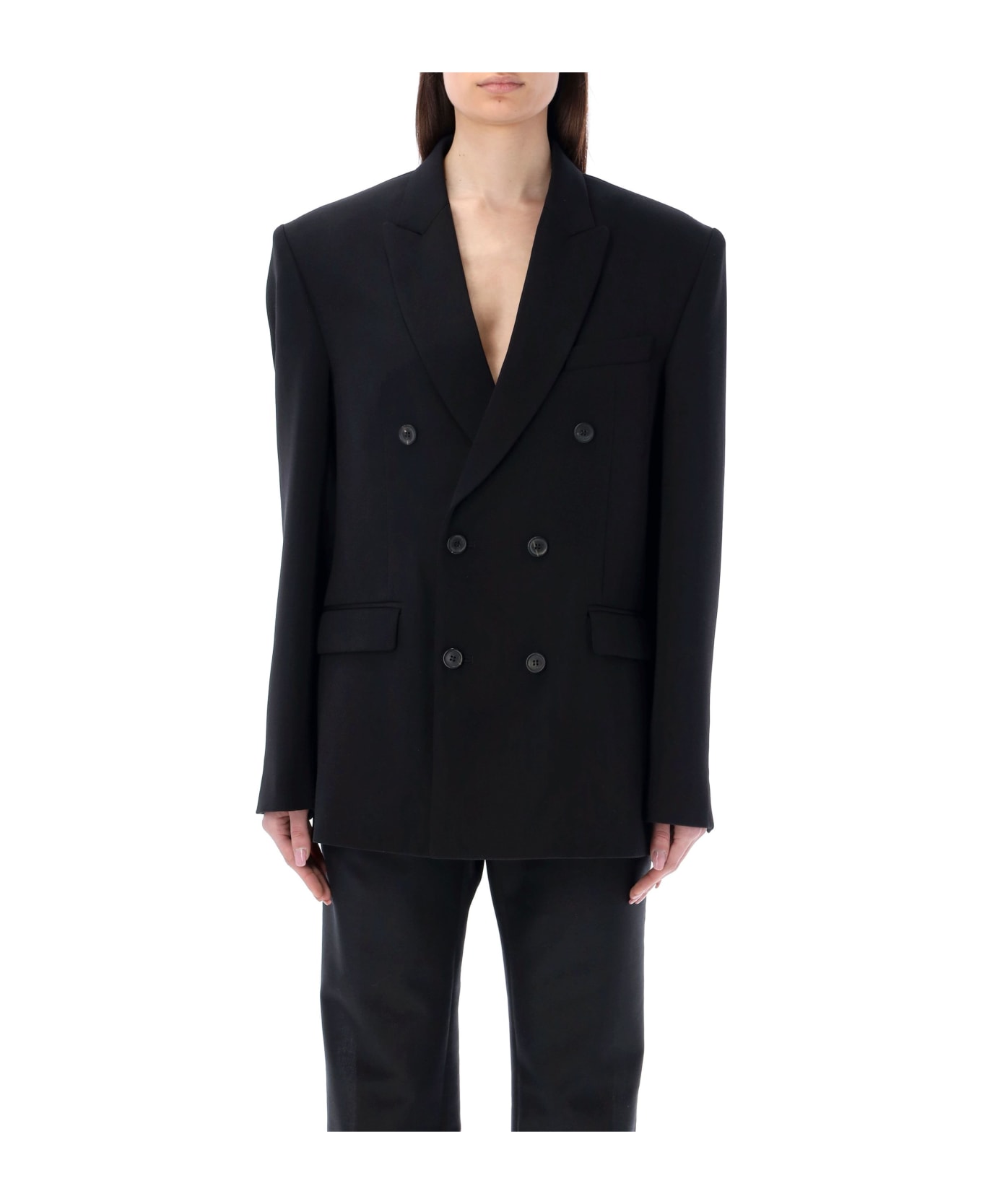Wool Double Breasted Blazer By Wardrobe Nyc. Featuring: Notch Lapels Double Breasted Buttons Fastening Chest Pocket Front Flap Pockets Buttoned Cuffs Loose Fit The Model Is 1,72 M Tall And She's Wearing Size S