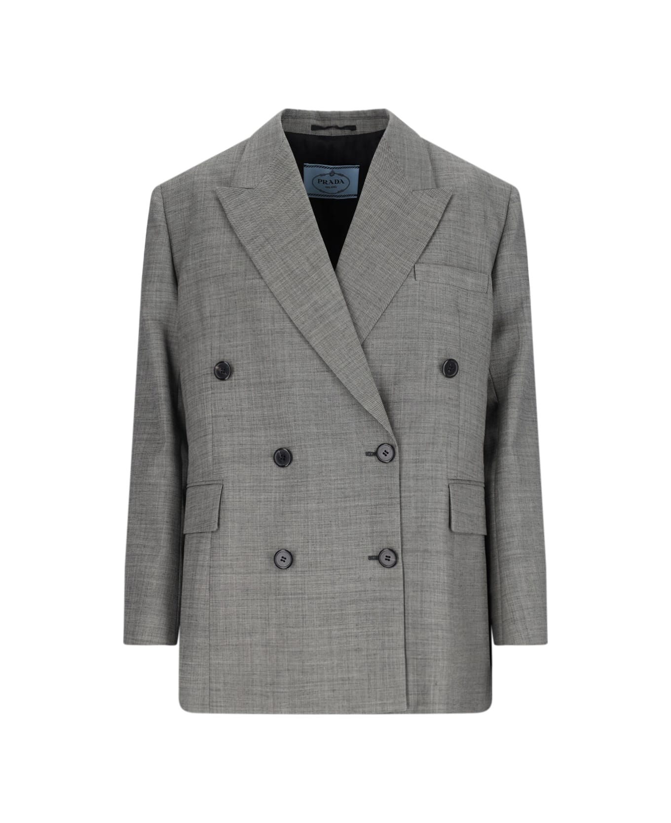 Prada double-breasted blazer, in grey wool, peaked lapels, button fastening, breast pocket, two side flap pockets, fabric triangle logo on back, button cuffs, straight hem. Composition: 100% Wool