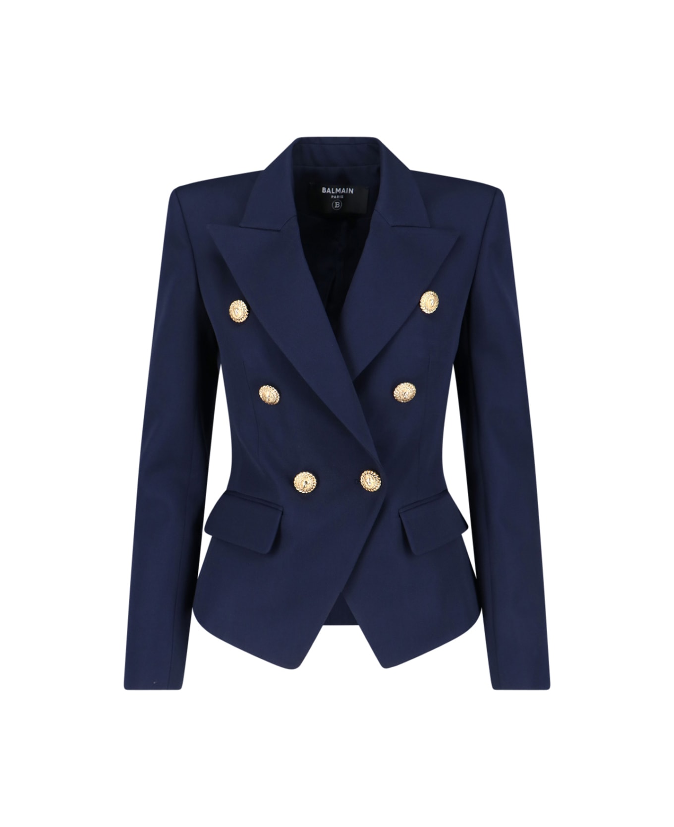 Balmain double-breasted blazer in blue virgin wool with peak lapels, gold metal button closure, two side pockets, button cuffs, curved hem. Composition: 100% Virgin Wool