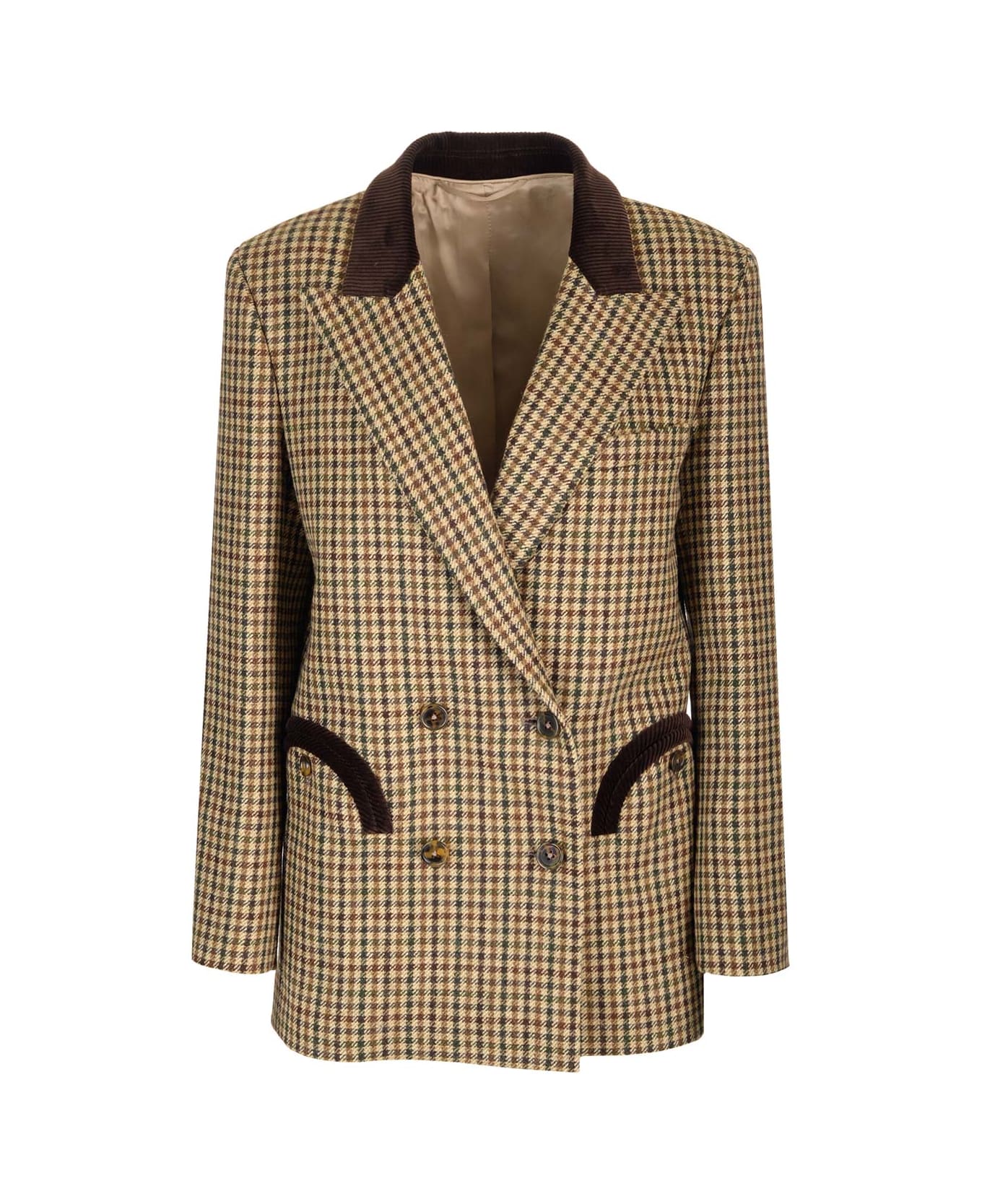 Houndstooth wool "Everynight" blazer from Blazè Milano, with low double-breasted design, brown velvet profiles, "Smiley" pockets, straight cut, 2 back vents.